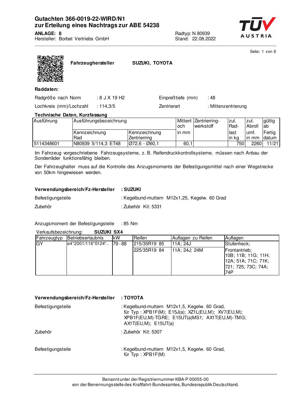 Dieses Gutachten (abe) bezieht sich auf die Alufelge Borbet N 80939 in der Ausführung 8Jx19 ET 0, Mittenloch 0 mm (KBA 54238). Im PDF findest du typischerweise zulässige Reifengrößen, Auflagen/Anbauhinweise und – je nach Dokument – Hinweise zur Eintragung.