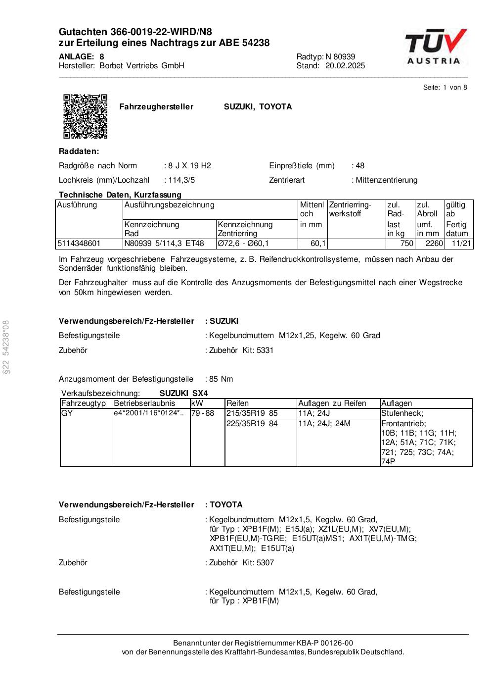 Dieses Gutachten (abe) bezieht sich auf die Alufelge Borbet N 80939 in der Ausführung 8Jx19 ET 0, Mittenloch 0 mm (KBA 54238). Im PDF findest du typischerweise zulässige Reifengrößen, Auflagen/Anbauhinweise und – je nach Dokument – Hinweise zur Eintragung.