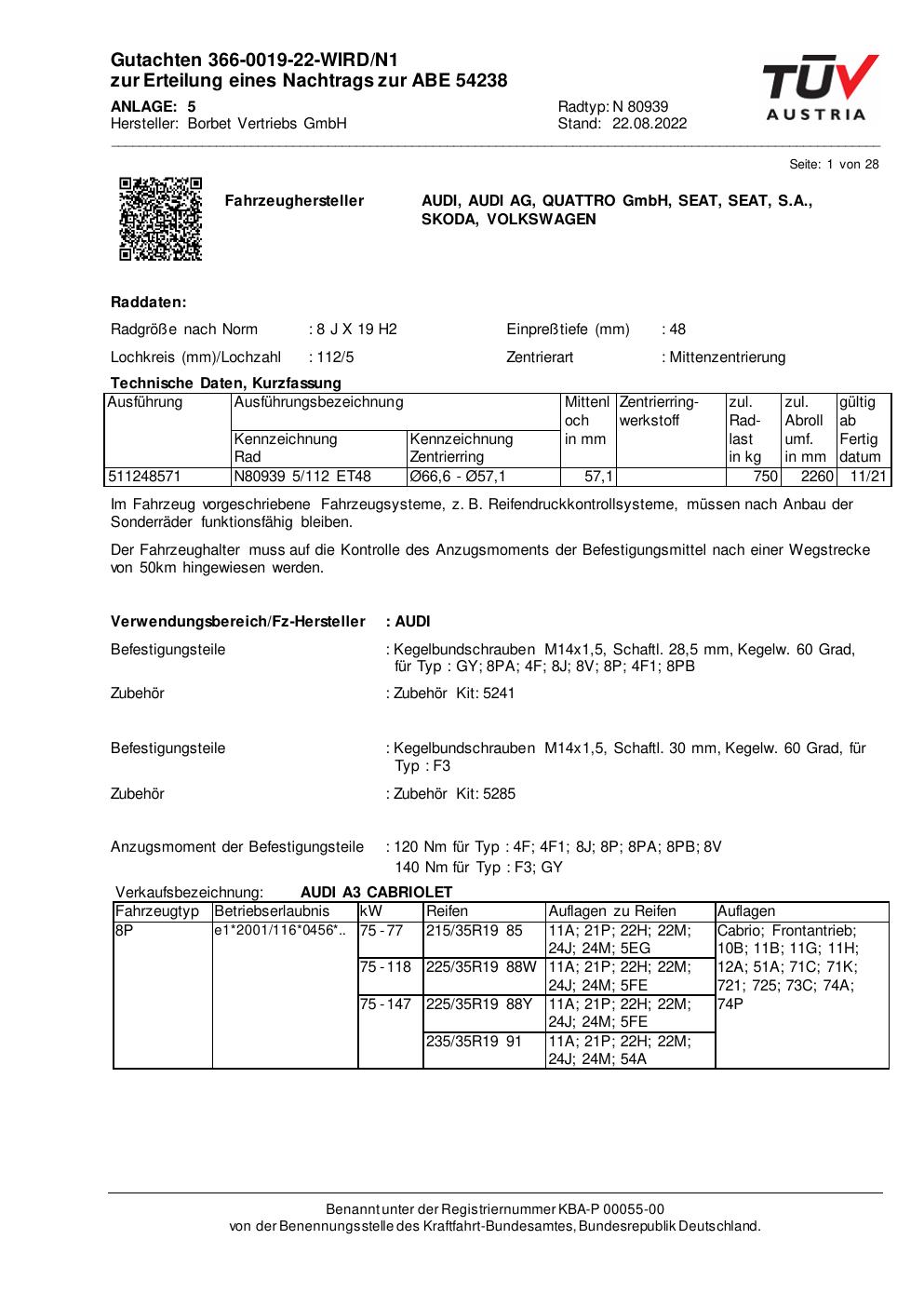 Dieses Gutachten (abe) bezieht sich auf die Alufelge Borbet N 80939 in der Ausführung 8Jx19 ET 0, Mittenloch 0 mm (KBA 54238). Im PDF findest du typischerweise zulässige Reifengrößen, Auflagen/Anbauhinweise und – je nach Dokument – Hinweise zur Eintragung.