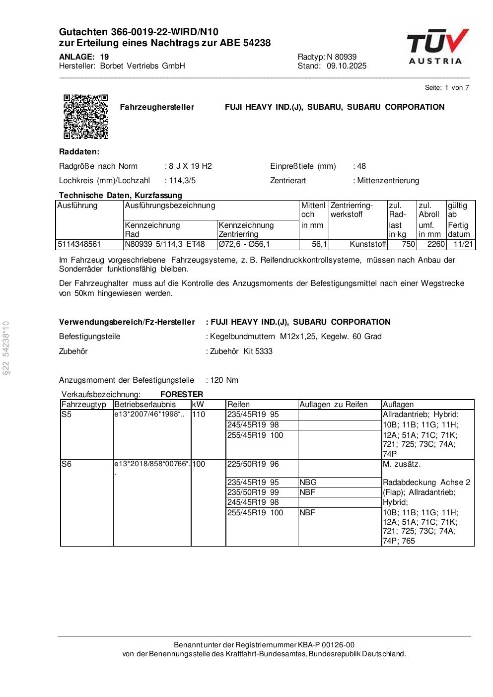 Dieses Gutachten (abe) bezieht sich auf die Alufelge Borbet N 80939 in der Ausführung 8Jx19 ET 0, Mittenloch 0 mm (KBA 54238). Im PDF findest du typischerweise zulässige Reifengrößen, Auflagen/Anbauhinweise und – je nach Dokument – Hinweise zur Eintragung.
