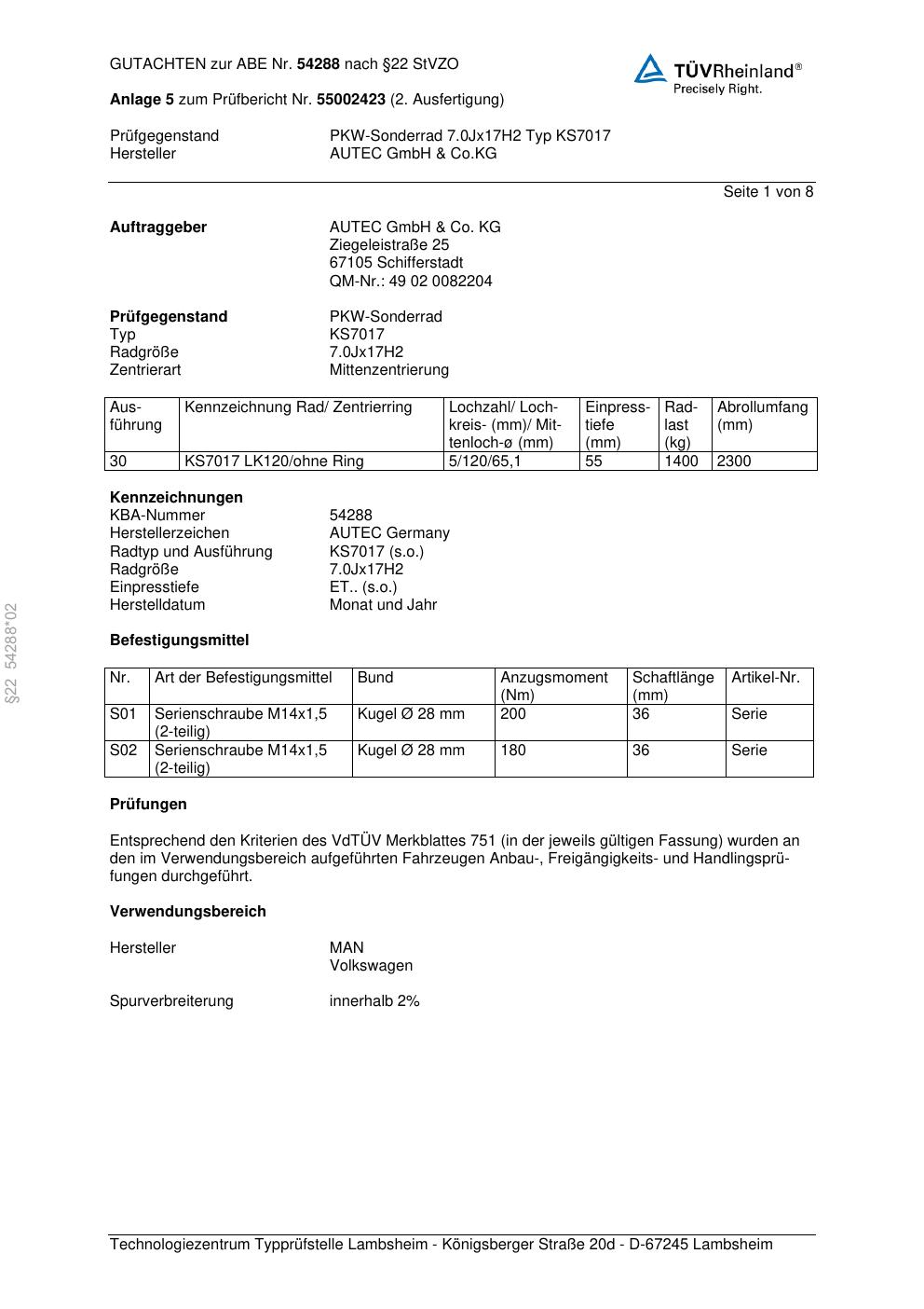 Dieses Gutachten (abe) bezieht sich auf die Alufelge Autec KS7017 in der Ausführung 7Jx17 ET 0, Mittenloch 0 mm (KBA 54288). Im PDF findest du typischerweise zulässige Reifengrößen, Auflagen/Anbauhinweise und – je nach Dokument – Hinweise zur Eintragung.