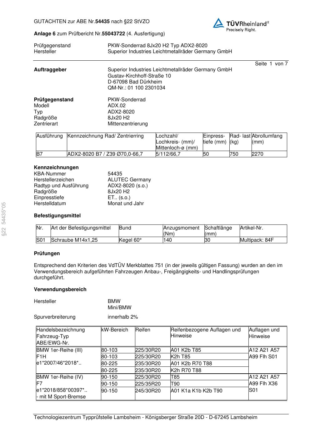 Dieses Gutachten (abe) bezieht sich auf die Alufelge ALUTEC ADX2-8020 in der Ausführung 8Jx2 ET 0, Mittenloch 0 mm (KBA 54435). Im PDF findest du typischerweise zulässige Reifengrößen, Auflagen/Anbauhinweise und – je nach Dokument – Hinweise zur Eintragung.