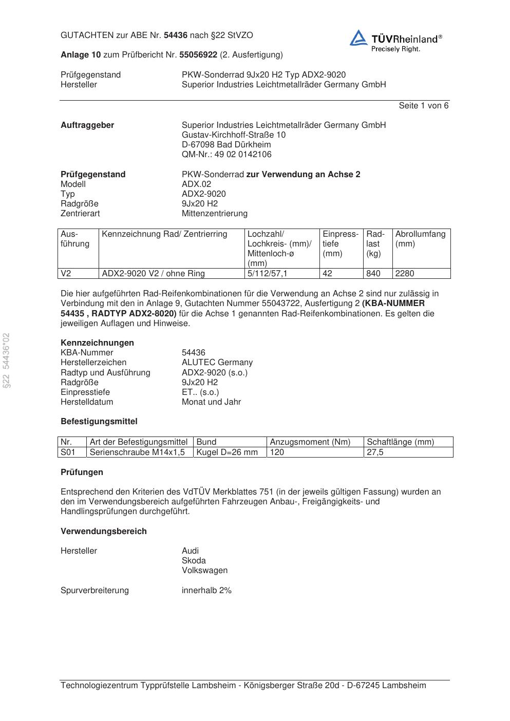 Felgengutachten / abe für Alufelgen ALUTEC ADX2-9020 (9Jx2 ET 0, Mittenloch 0 mm) mit KBA 54436 (Zertifikatsnummer 54436). Hier kostenlos als PDF herunterladen. Der Download-Link ist 24 Stunden gültig und kann bis zu zwei Mal verwendet werden.
