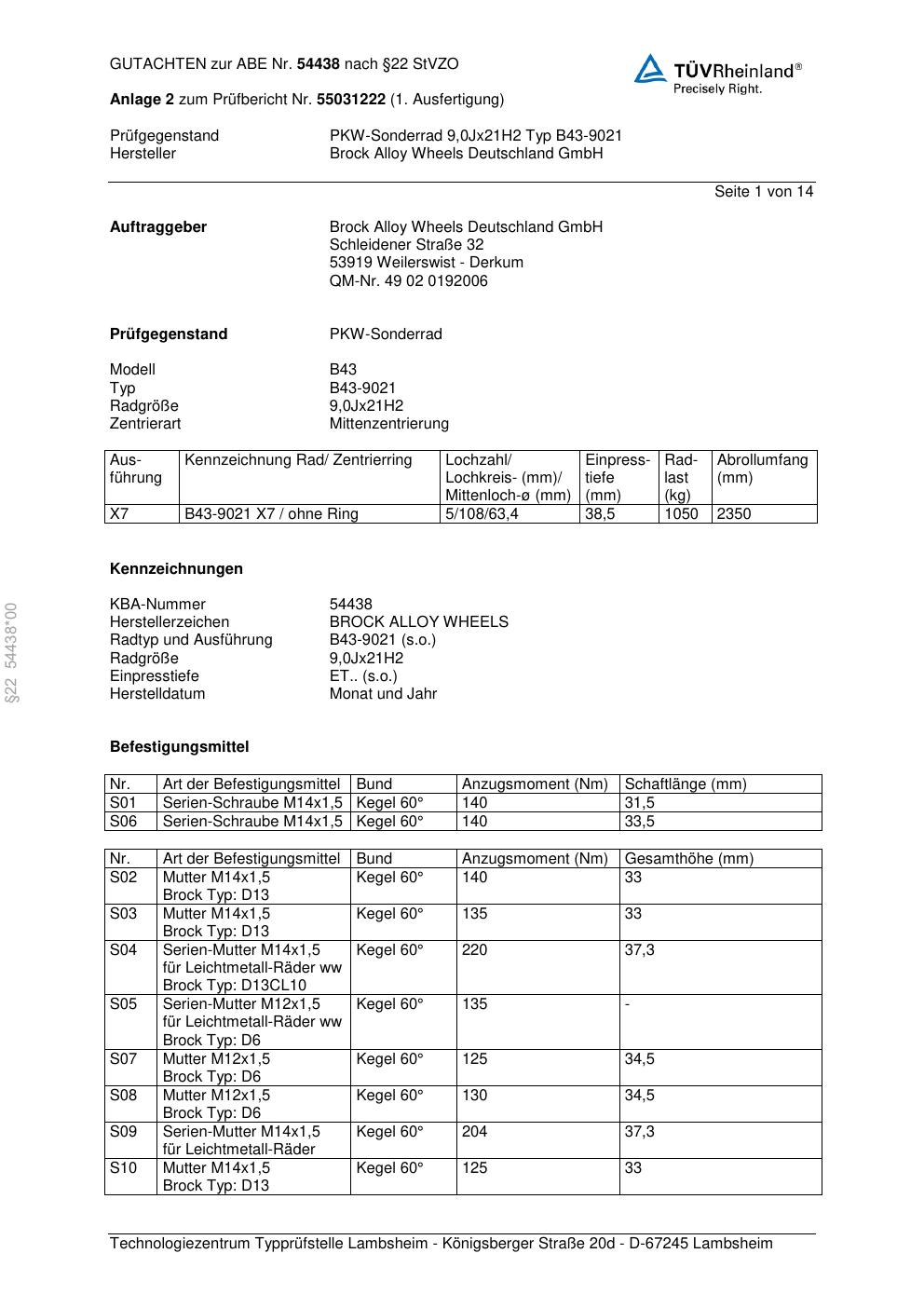Dieses Gutachten (abe) bezieht sich auf die Alufelge Brock B43-9021 in der Ausführung 9Jx21 ET 0, Mittenloch 0 mm (KBA 54438). Im PDF findest du typischerweise zulässige Reifengrößen, Auflagen/Anbauhinweise und – je nach Dokument – Hinweise zur Eintragung.