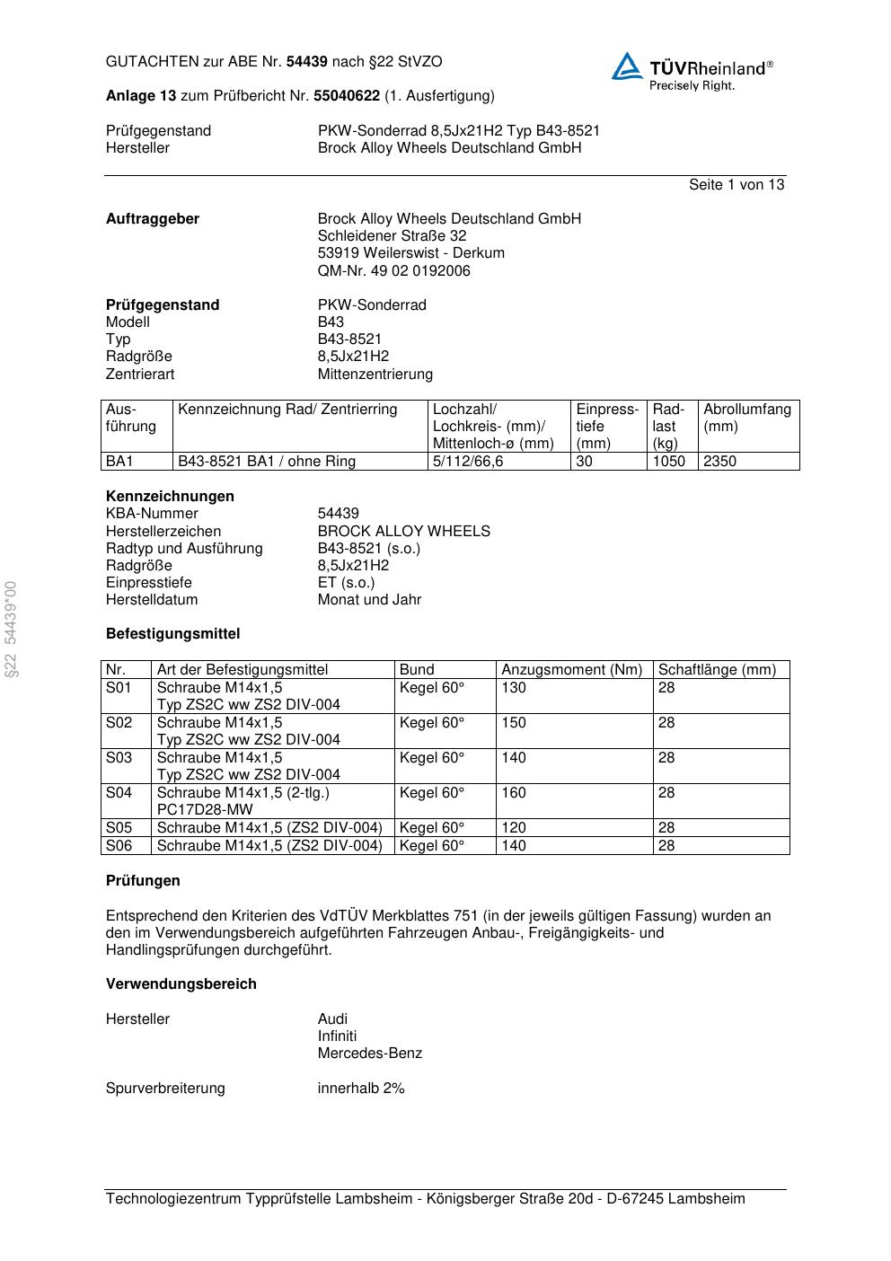 Dieses Gutachten (abe) bezieht sich auf die Alufelge Brock B43-8521 in der Ausführung 8.5Jx21 ET 0, Mittenloch 0 mm (KBA 54439). Im PDF findest du typischerweise zulässige Reifengrößen, Auflagen/Anbauhinweise und – je nach Dokument – Hinweise zur Eintragung.