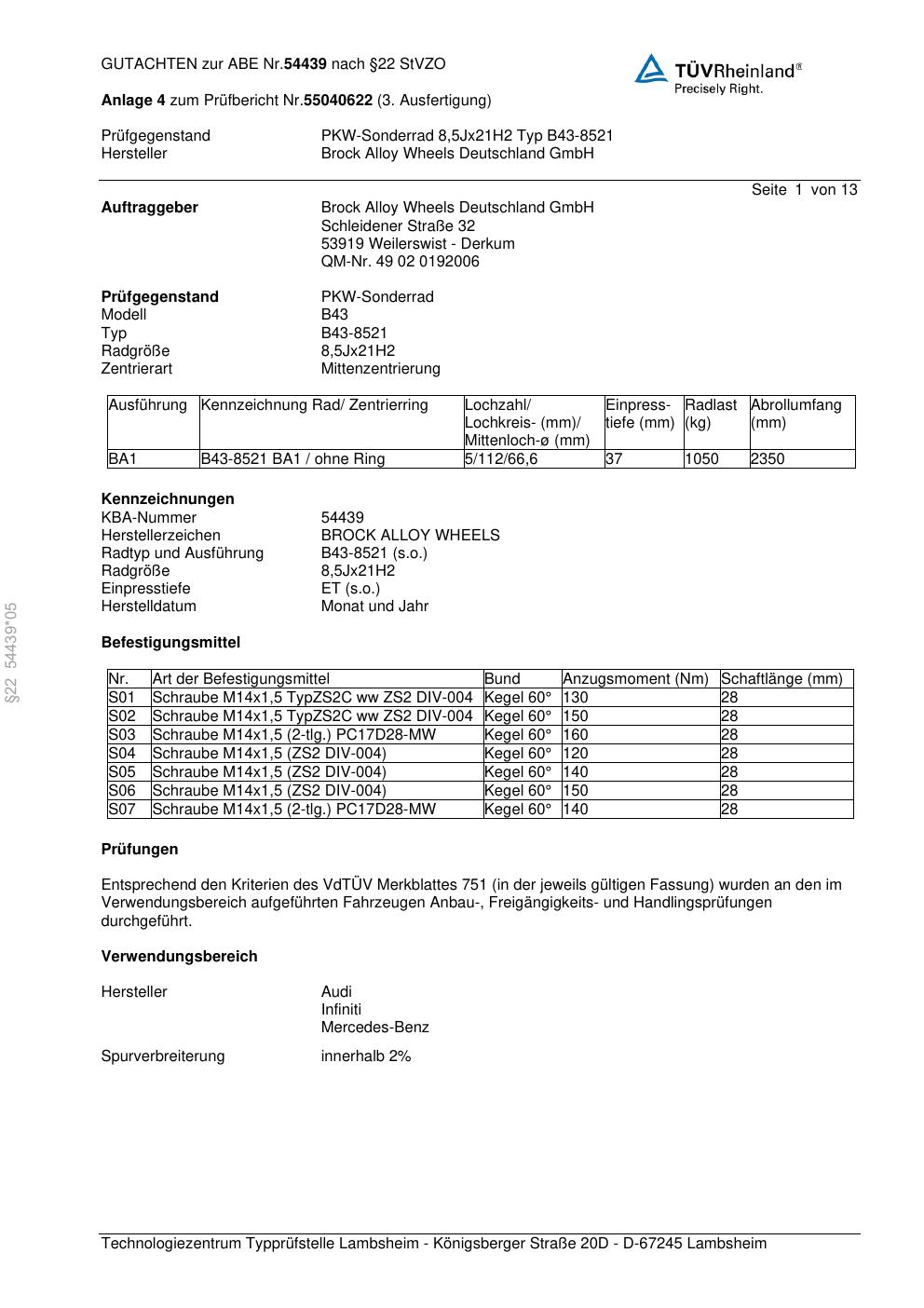Dieses Gutachten (abe) bezieht sich auf die Alufelge Brock B43-8521 in der Ausführung 8.5Jx21 ET 0, Mittenloch 0 mm (KBA 54439). Im PDF findest du typischerweise zulässige Reifengrößen, Auflagen/Anbauhinweise und – je nach Dokument – Hinweise zur Eintragung.