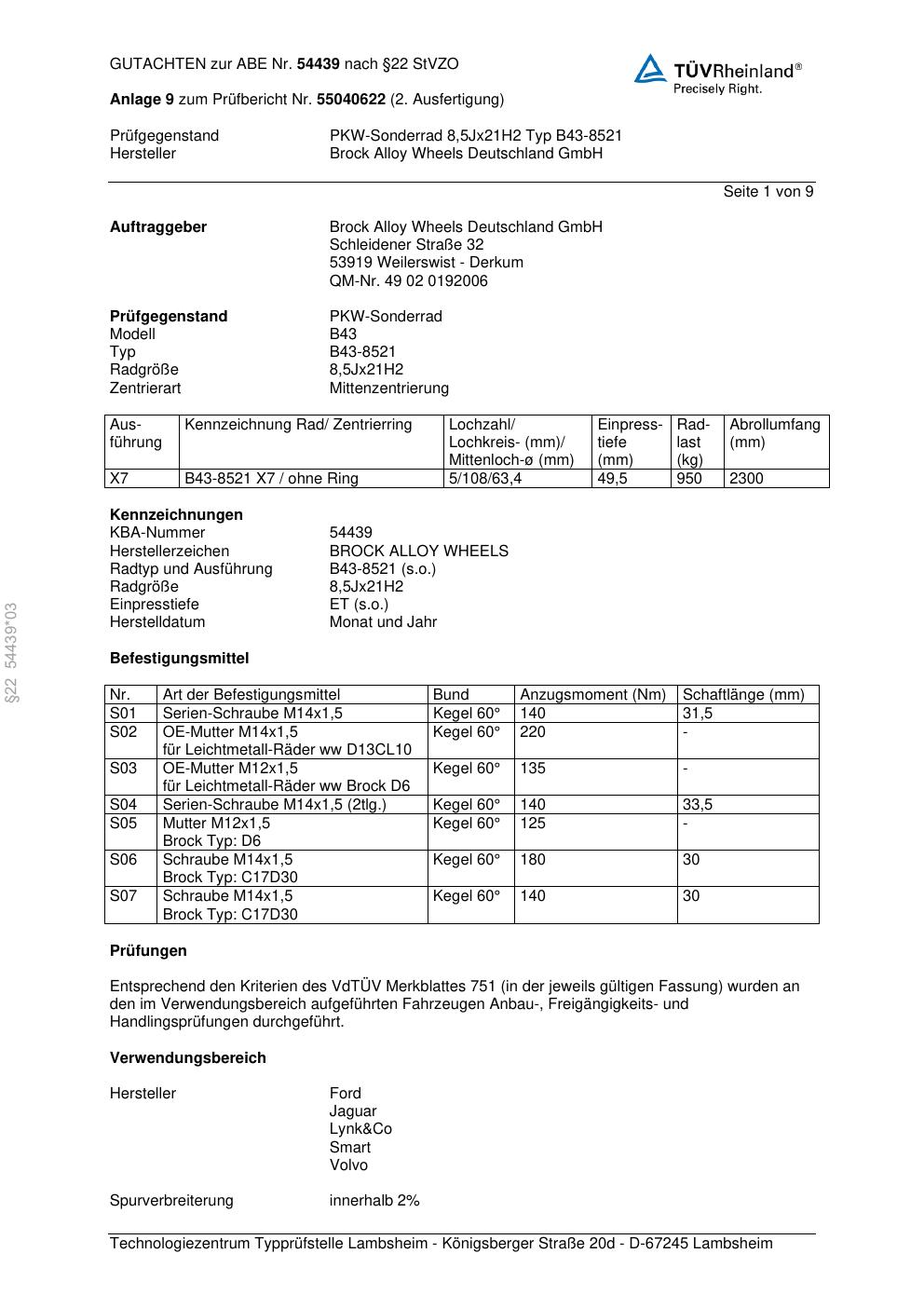 Dieses Gutachten (abe) bezieht sich auf die Alufelge Brock B43-8521 in der Ausführung 8.5Jx21 ET 0, Mittenloch 0 mm (KBA 54439). Im PDF findest du typischerweise zulässige Reifengrößen, Auflagen/Anbauhinweise und – je nach Dokument – Hinweise zur Eintragung.