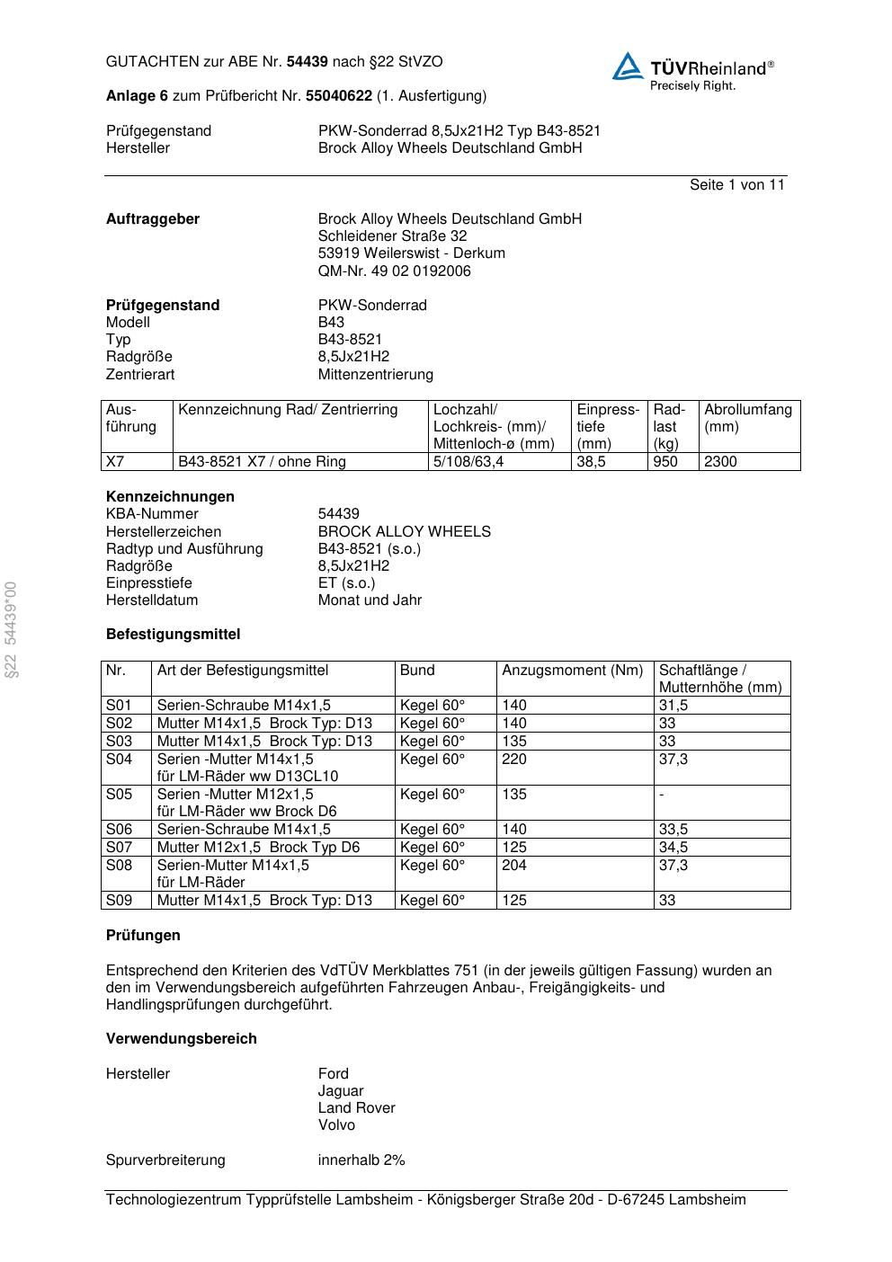Dieses Gutachten (abe) bezieht sich auf die Alufelge Brock B43-8521 in der Ausführung 8.5Jx21 ET 0, Mittenloch 0 mm (KBA 54439). Im PDF findest du typischerweise zulässige Reifengrößen, Auflagen/Anbauhinweise und – je nach Dokument – Hinweise zur Eintragung.