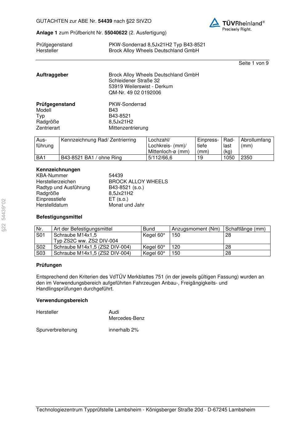 Dieses Gutachten (abe) bezieht sich auf die Alufelge Brock B43-8521 in der Ausführung 8.5Jx21 ET 0, Mittenloch 0 mm (KBA 54439). Im PDF findest du typischerweise zulässige Reifengrößen, Auflagen/Anbauhinweise und – je nach Dokument – Hinweise zur Eintragung.