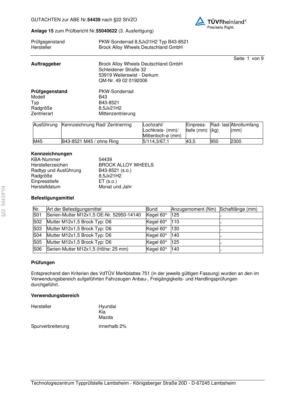 Dieses Gutachten (abe) bezieht sich auf die Alufelge Brock B43-8521 in der Ausführung 8.5Jx21 ET 0, Mittenloch 0 mm (KBA 54439). Im PDF findest du typischerweise zulässige Reifengrößen, Auflagen/Anbauhinweise und – je nach Dokument – Hinweise zur Eintragung.