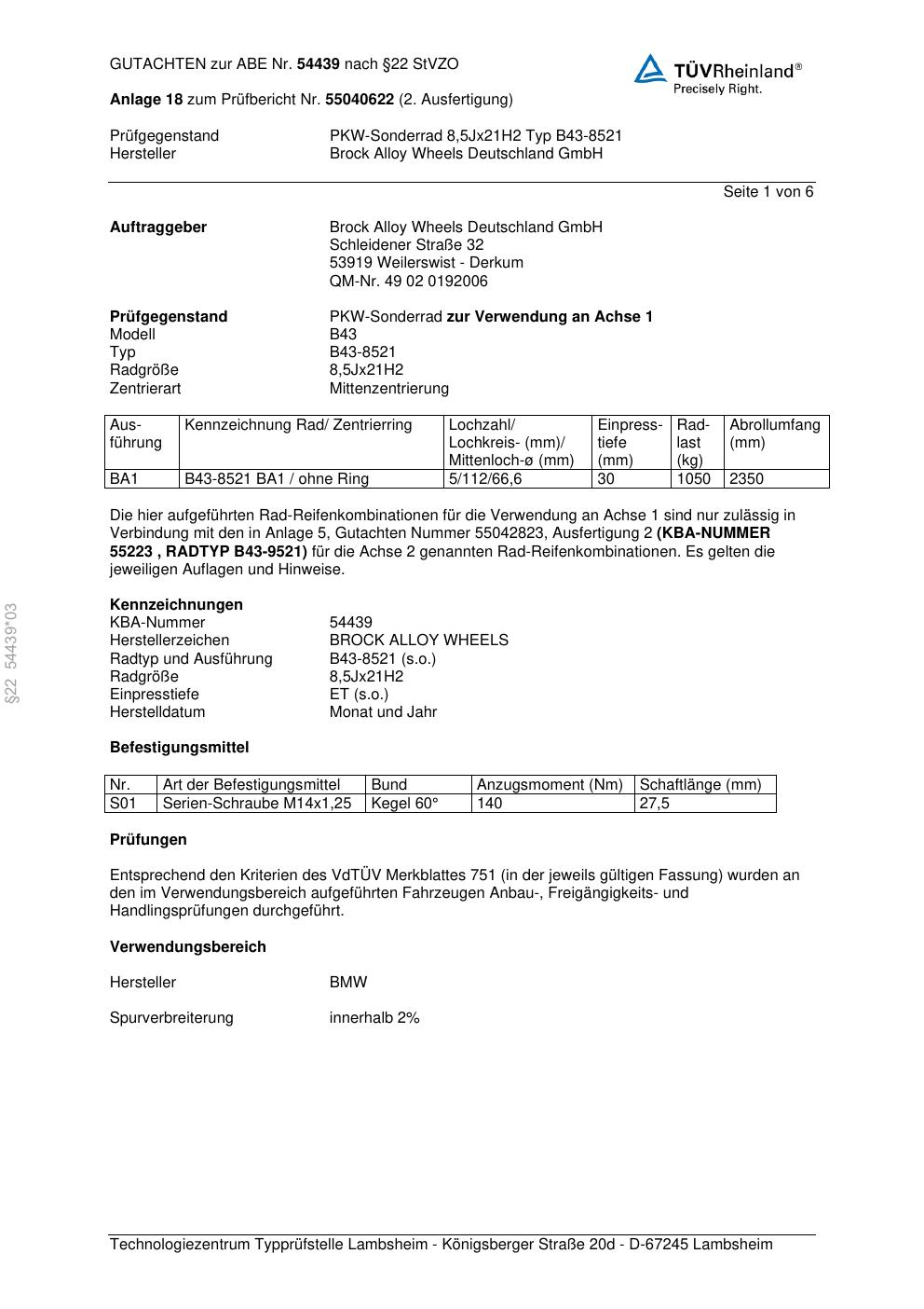 Dieses Gutachten (abe) bezieht sich auf die Alufelge Brock B43-8521 in der Ausführung 8.5Jx21 ET 0, Mittenloch 0 mm (KBA 54439). Im PDF findest du typischerweise zulässige Reifengrößen, Auflagen/Anbauhinweise und – je nach Dokument – Hinweise zur Eintragung.