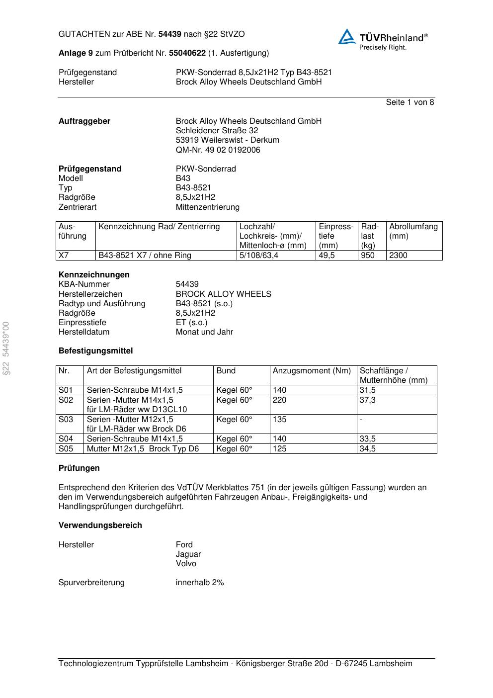 Dieses Gutachten (abe) bezieht sich auf die Alufelge Brock B43-8521 in der Ausführung 8.5Jx21 ET 0, Mittenloch 0 mm (KBA 54439). Im PDF findest du typischerweise zulässige Reifengrößen, Auflagen/Anbauhinweise und – je nach Dokument – Hinweise zur Eintragung.