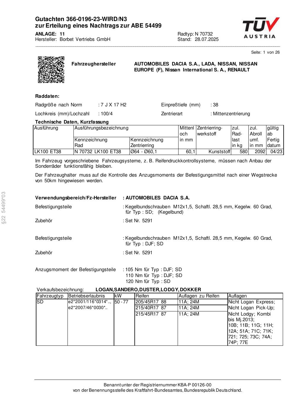 Dieses Gutachten (abe) bezieht sich auf die Alufelge Borbet N 70732 in der Ausführung 7Jx17 ET 0, Mittenloch 0 mm (KBA 54499). Im PDF findest du typischerweise zulässige Reifengrößen, Auflagen/Anbauhinweise und – je nach Dokument – Hinweise zur Eintragung.