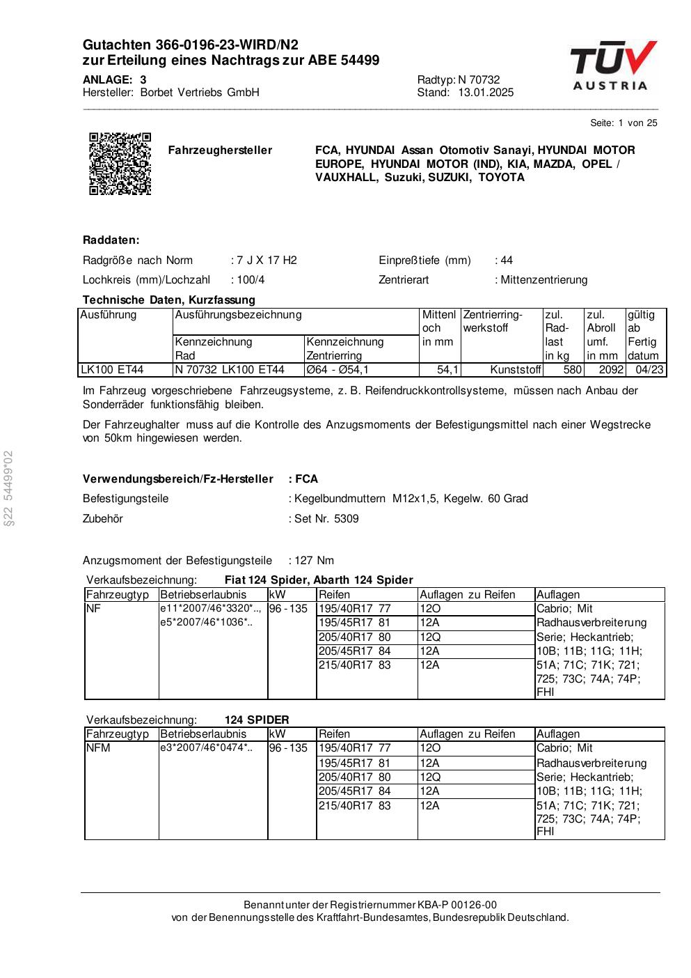 Dieses Gutachten (abe) bezieht sich auf die Alufelge Borbet N 70732 in der Ausführung 7Jx17 ET 0, Mittenloch 0 mm (KBA 54499). Im PDF findest du typischerweise zulässige Reifengrößen, Auflagen/Anbauhinweise und – je nach Dokument – Hinweise zur Eintragung.
