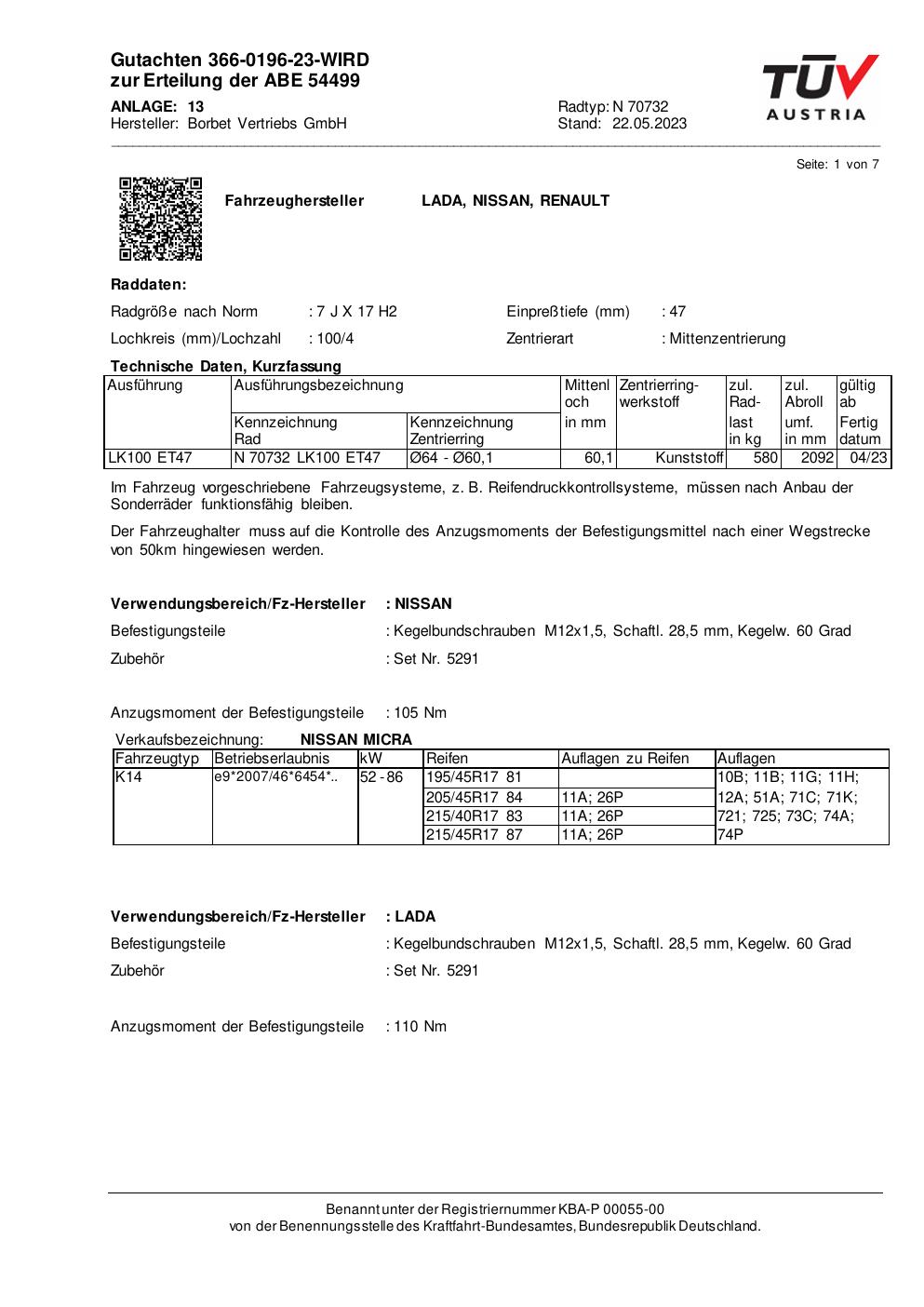 Dieses Gutachten (abe) bezieht sich auf die Alufelge Borbet N 70732 in der Ausführung 7Jx17 ET 0, Mittenloch 0 mm (KBA 54499). Im PDF findest du typischerweise zulässige Reifengrößen, Auflagen/Anbauhinweise und – je nach Dokument – Hinweise zur Eintragung.