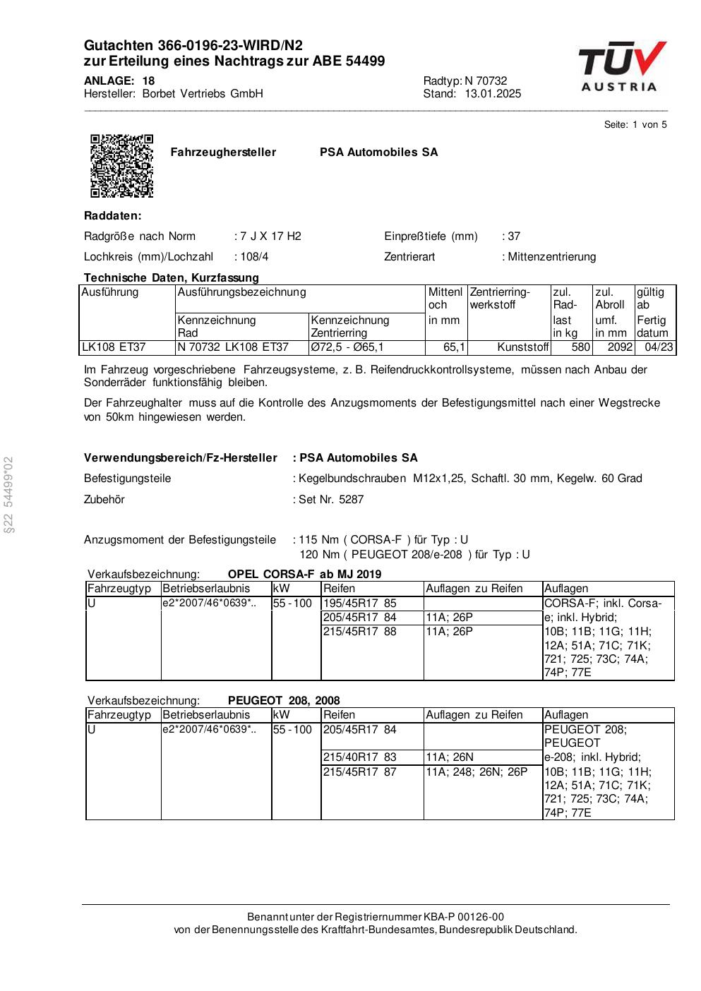 Dieses Gutachten (abe) bezieht sich auf die Alufelge Borbet N 70732 in der Ausführung 7Jx17 ET 0, Mittenloch 0 mm (KBA 54499). Im PDF findest du typischerweise zulässige Reifengrößen, Auflagen/Anbauhinweise und – je nach Dokument – Hinweise zur Eintragung.