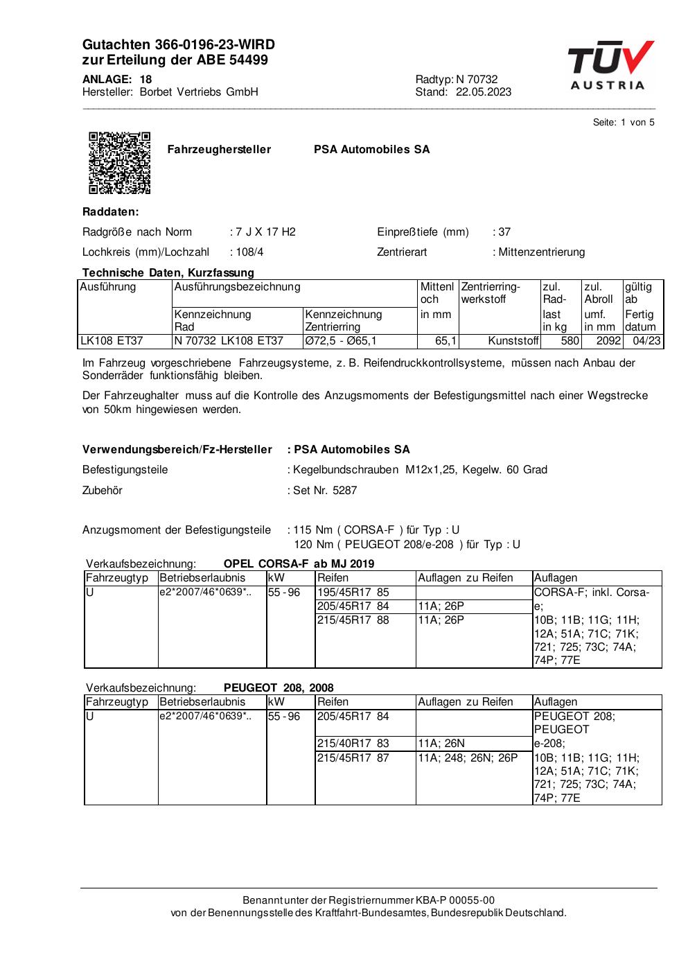 Dieses Gutachten (abe) bezieht sich auf die Alufelge Borbet N 70732 in der Ausführung 7Jx17 ET 0, Mittenloch 0 mm (KBA 54499). Im PDF findest du typischerweise zulässige Reifengrößen, Auflagen/Anbauhinweise und – je nach Dokument – Hinweise zur Eintragung.