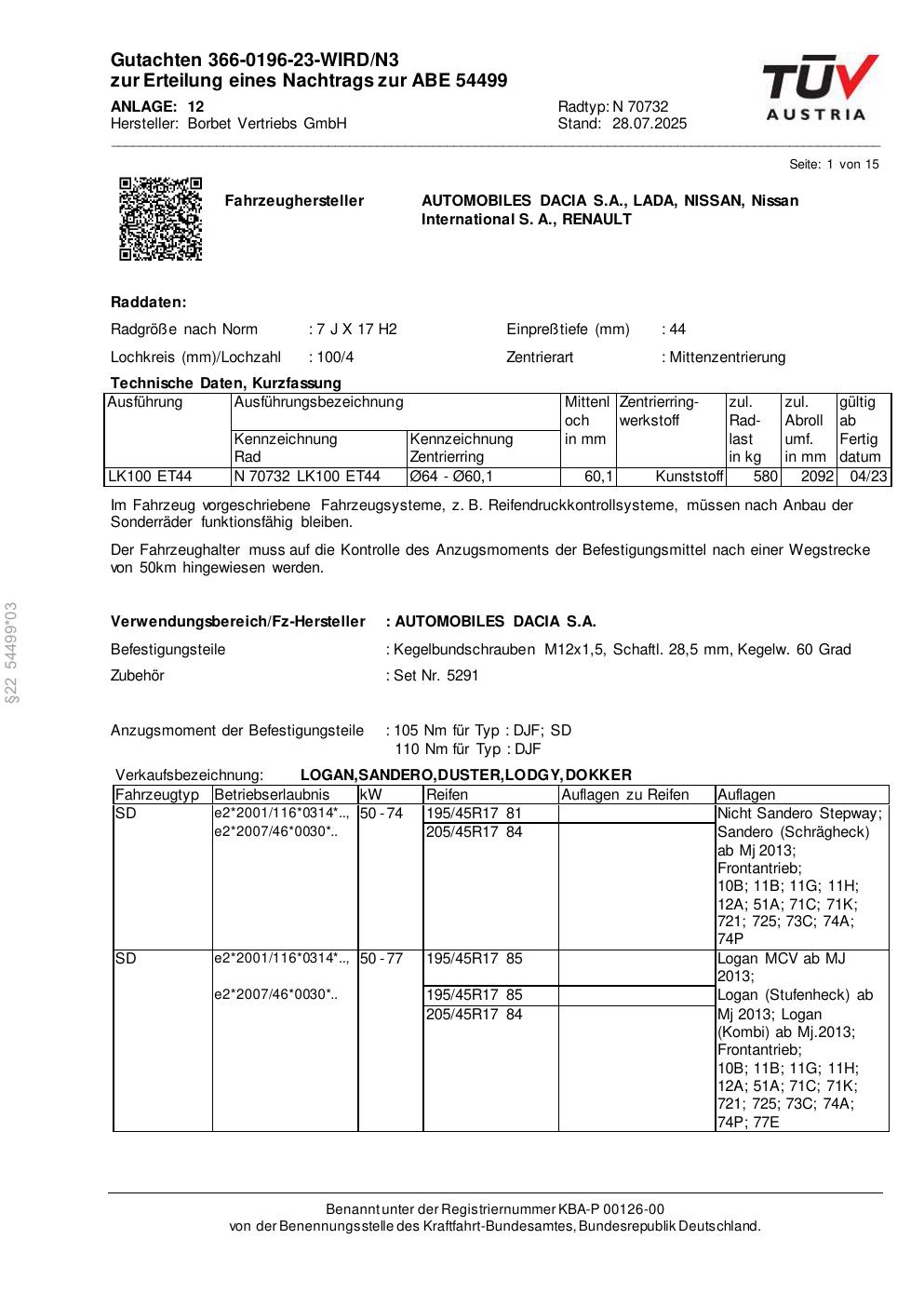 Dieses Gutachten (abe) bezieht sich auf die Alufelge Borbet N 70732 in der Ausführung 7Jx17 ET 0, Mittenloch 0 mm (KBA 54499). Im PDF findest du typischerweise zulässige Reifengrößen, Auflagen/Anbauhinweise und – je nach Dokument – Hinweise zur Eintragung.