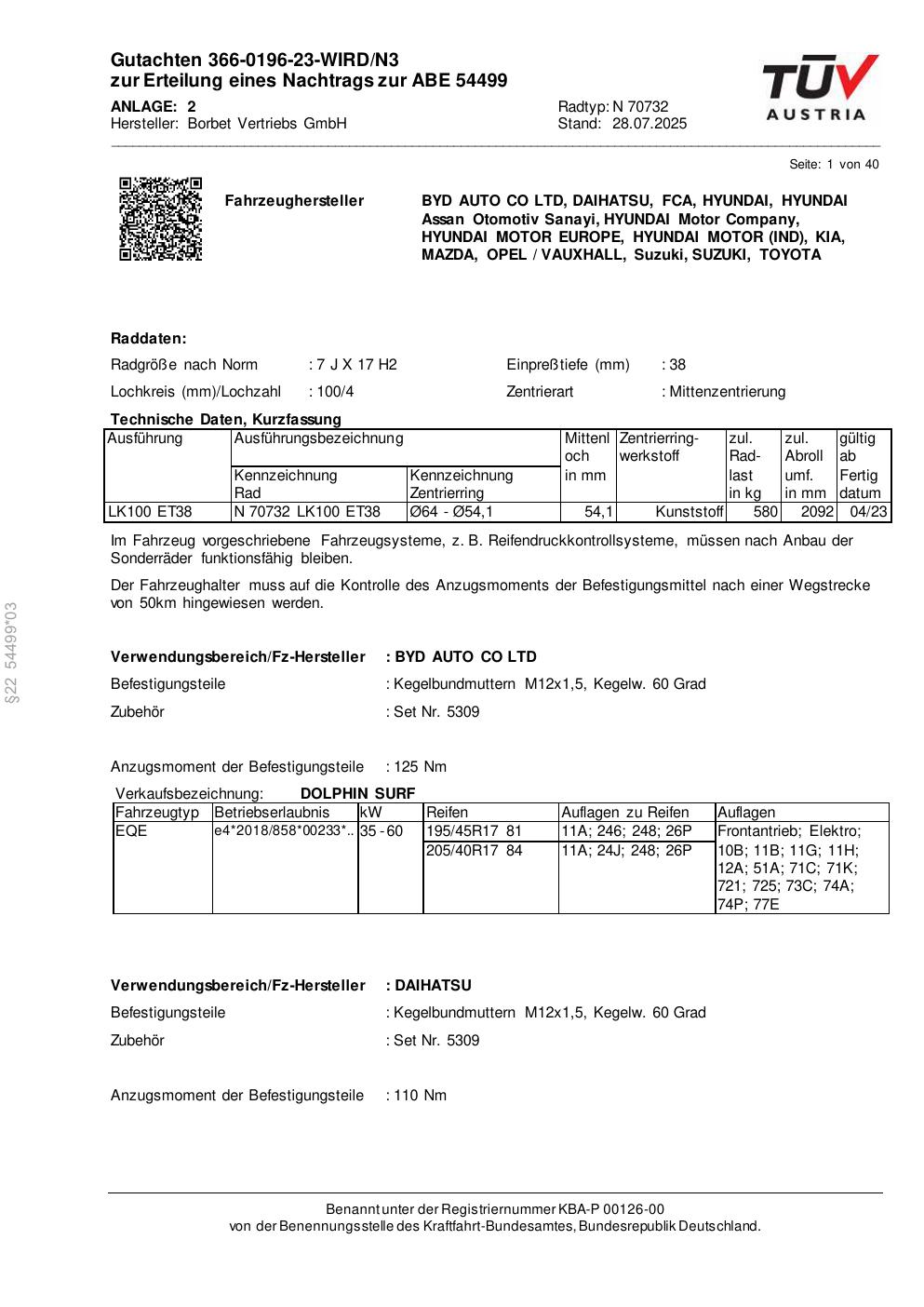 Dieses Gutachten (abe) bezieht sich auf die Alufelge Borbet N 70732 in der Ausführung 7Jx17 ET 0, Mittenloch 0 mm (KBA 54499). Im PDF findest du typischerweise zulässige Reifengrößen, Auflagen/Anbauhinweise und – je nach Dokument – Hinweise zur Eintragung.