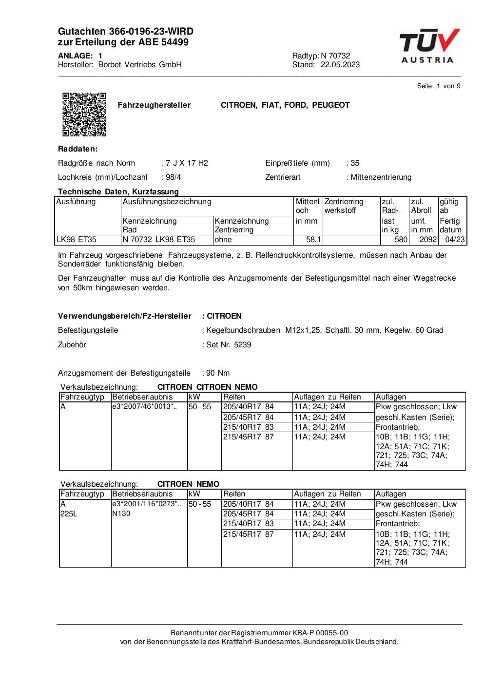 Dieses Gutachten (abe) bezieht sich auf die Alufelge Borbet N 70732 in der Ausführung 7Jx17 ET 0, Mittenloch 0 mm (KBA 54499). Im PDF findest du typischerweise zulässige Reifengrößen, Auflagen/Anbauhinweise und – je nach Dokument – Hinweise zur Eintragung.