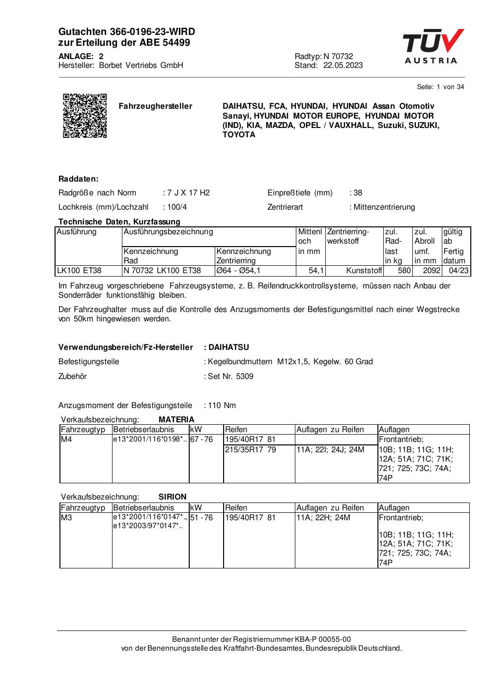 Dieses Gutachten (abe) bezieht sich auf die Alufelge Borbet N 70732 in der Ausführung 7Jx17 ET 0, Mittenloch 0 mm (KBA 54499). Im PDF findest du typischerweise zulässige Reifengrößen, Auflagen/Anbauhinweise und – je nach Dokument – Hinweise zur Eintragung.