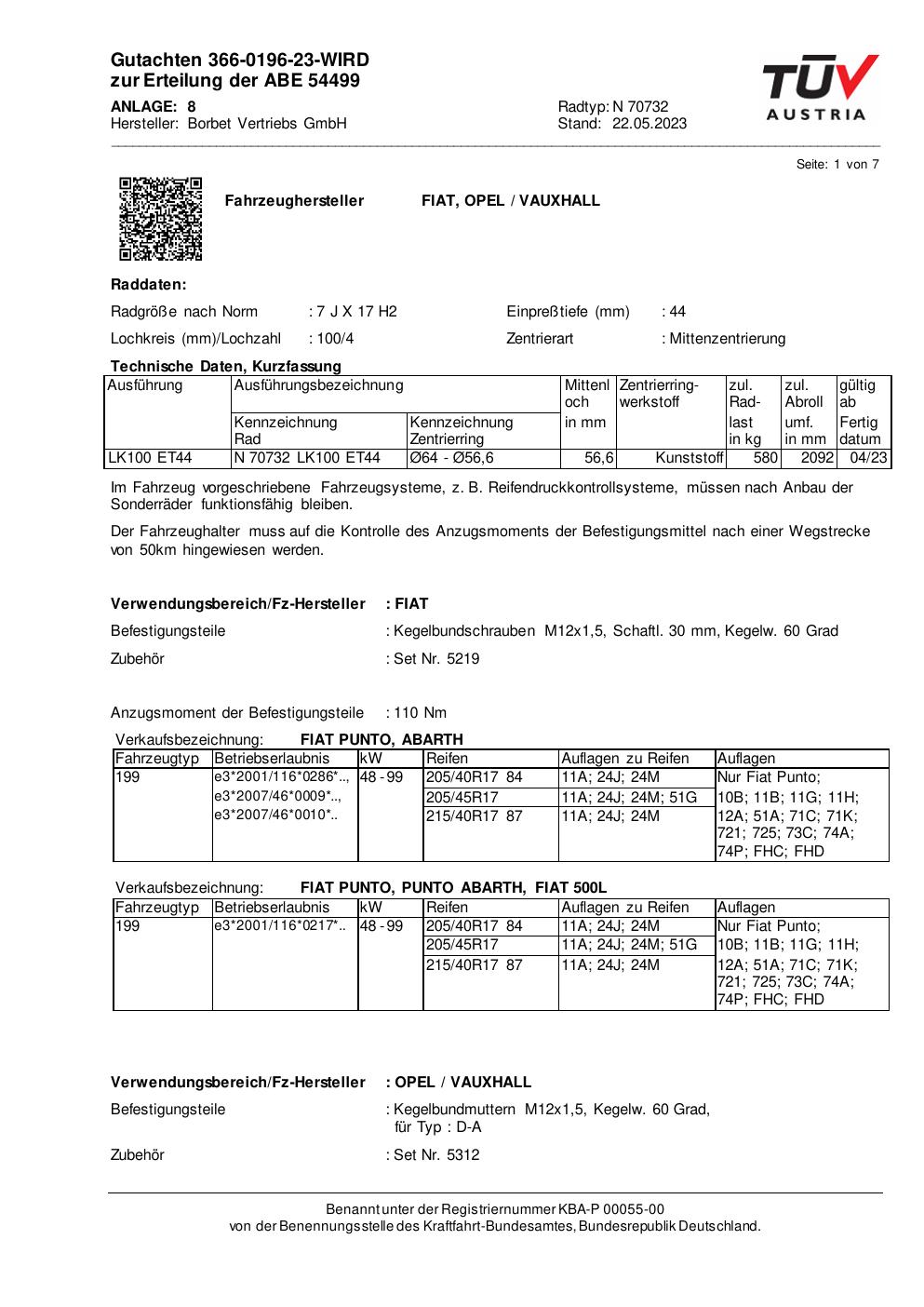 Dieses Gutachten (abe) bezieht sich auf die Alufelge Borbet N 70732 in der Ausführung 7Jx17 ET 0, Mittenloch 0 mm (KBA 54499). Im PDF findest du typischerweise zulässige Reifengrößen, Auflagen/Anbauhinweise und – je nach Dokument – Hinweise zur Eintragung.