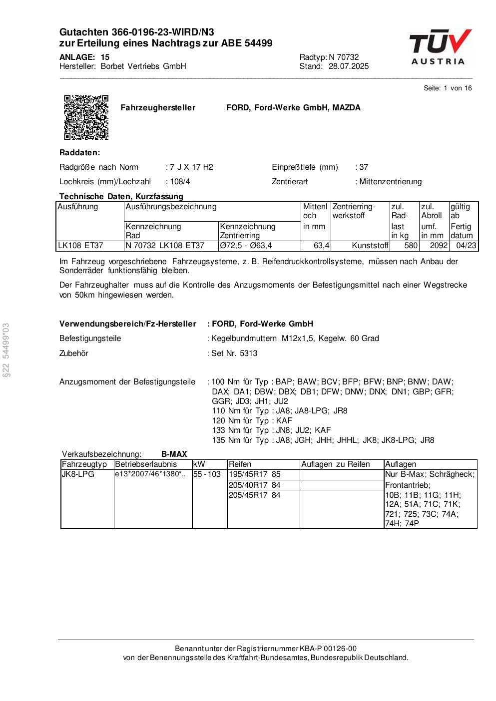 Dieses Gutachten (abe) bezieht sich auf die Alufelge Borbet N 70732 in der Ausführung 7Jx17 ET 0, Mittenloch 0 mm (KBA 54499). Im PDF findest du typischerweise zulässige Reifengrößen, Auflagen/Anbauhinweise und – je nach Dokument – Hinweise zur Eintragung.