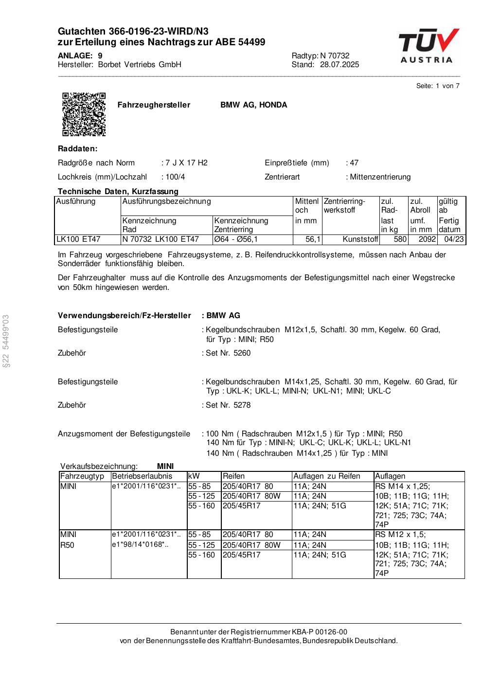 Dieses Gutachten (abe) bezieht sich auf die Alufelge Borbet N 70732 in der Ausführung 7Jx17 ET 0, Mittenloch 0 mm (KBA 54499). Im PDF findest du typischerweise zulässige Reifengrößen, Auflagen/Anbauhinweise und – je nach Dokument – Hinweise zur Eintragung.