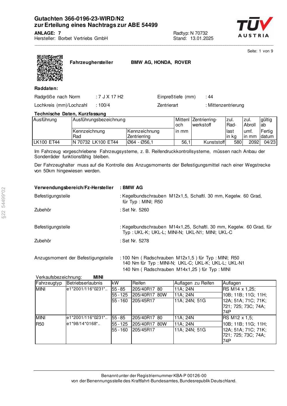 Dieses Gutachten (abe) bezieht sich auf die Alufelge Borbet N 70732 in der Ausführung 7Jx17 ET 0, Mittenloch 0 mm (KBA 54499). Im PDF findest du typischerweise zulässige Reifengrößen, Auflagen/Anbauhinweise und – je nach Dokument – Hinweise zur Eintragung.