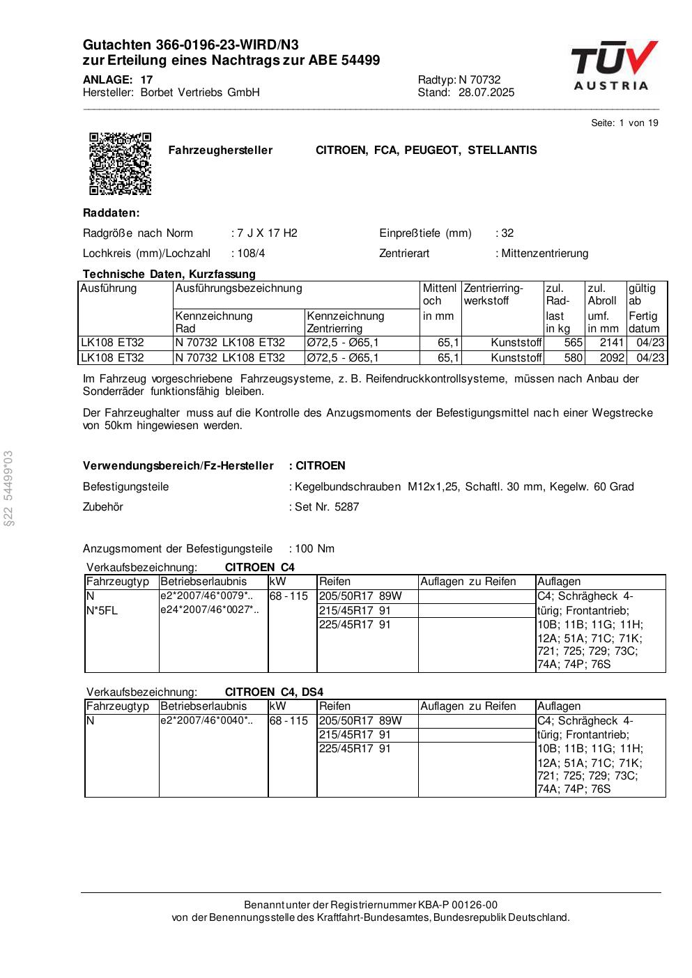 Dieses Gutachten (abe) bezieht sich auf die Alufelge Borbet N 70732 in der Ausführung 7Jx17 ET 0, Mittenloch 0 mm (KBA 54499). Im PDF findest du typischerweise zulässige Reifengrößen, Auflagen/Anbauhinweise und – je nach Dokument – Hinweise zur Eintragung.