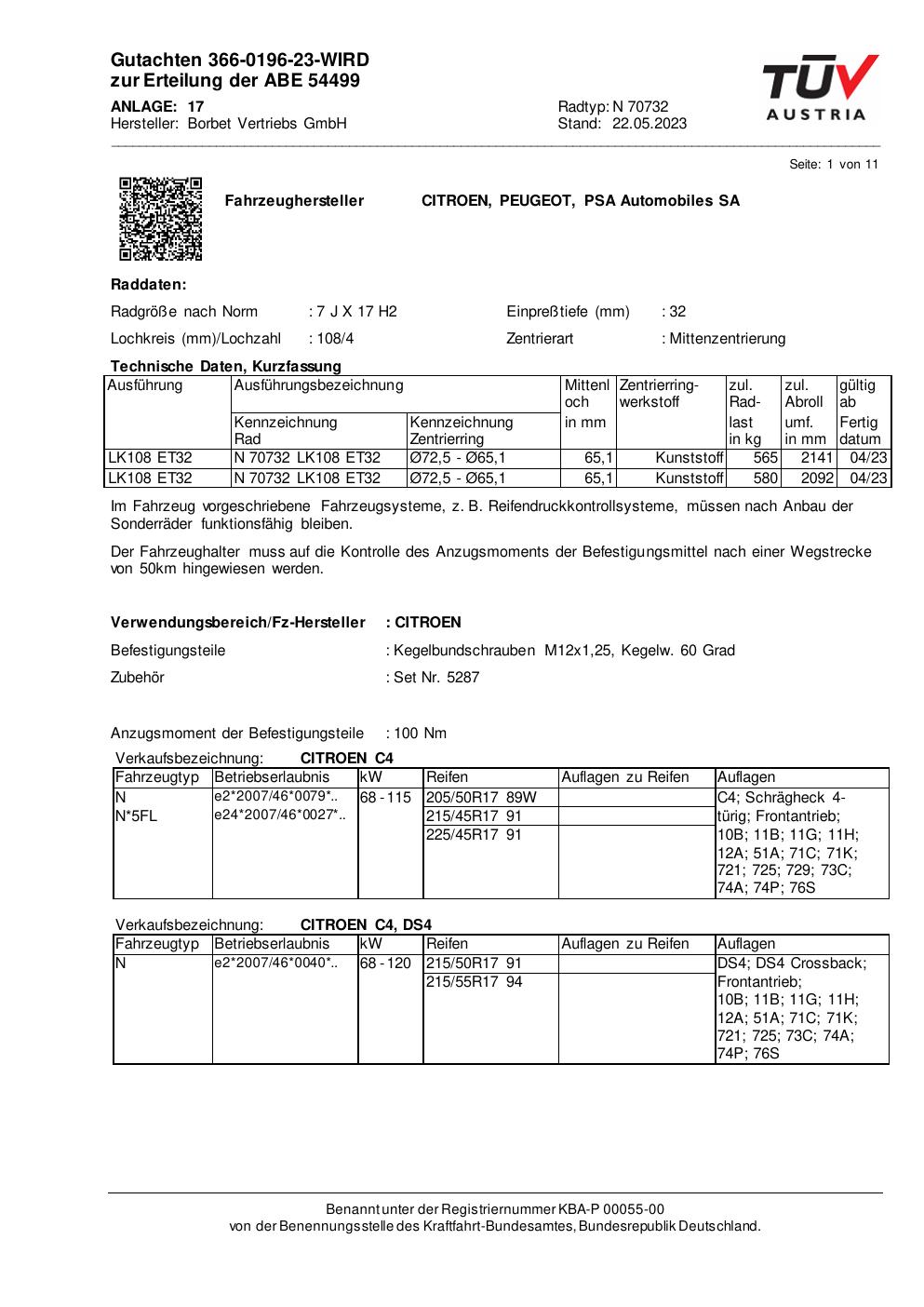 Dieses Gutachten (abe) bezieht sich auf die Alufelge Borbet N 70732 in der Ausführung 7Jx17 ET 0, Mittenloch 0 mm (KBA 54499). Im PDF findest du typischerweise zulässige Reifengrößen, Auflagen/Anbauhinweise und – je nach Dokument – Hinweise zur Eintragung.