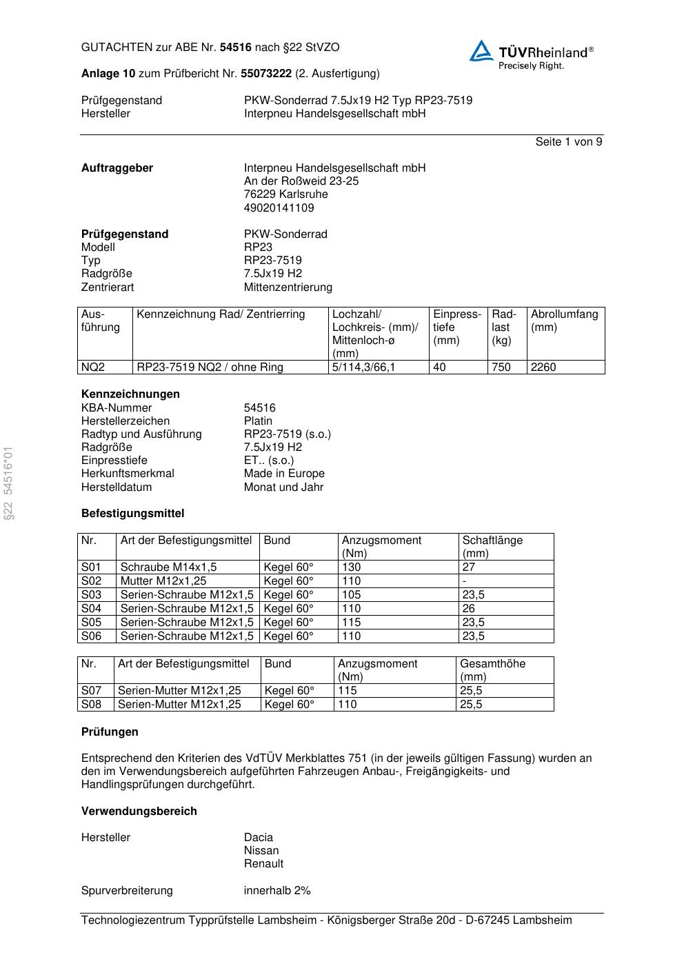 Dieses Gutachten (abe) bezieht sich auf die Alufelge Platin RP23-75 19 in der Ausführung 7.5Jx19 ET 0, Mittenloch 0 mm (KBA 54516). Im PDF findest du typischerweise zulässige Reifengrößen, Auflagen/Anbauhinweise und – je nach Dokument – Hinweise zur Eintragung.