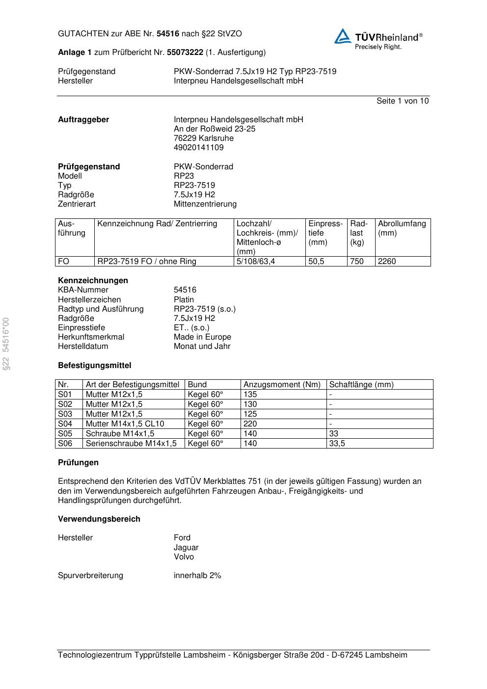Dieses Gutachten (abe) bezieht sich auf die Alufelge Platin RP23-75 19 in der Ausführung 7.5Jx19 ET 0, Mittenloch 0 mm (KBA 54516). Im PDF findest du typischerweise zulässige Reifengrößen, Auflagen/Anbauhinweise und – je nach Dokument – Hinweise zur Eintragung.