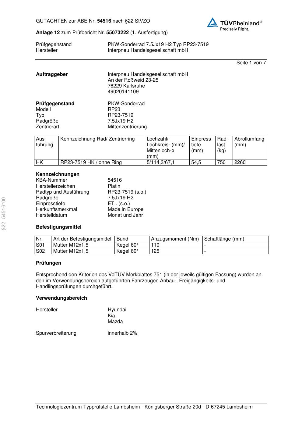 Dieses Gutachten (abe) bezieht sich auf die Alufelge Platin RP23-75 19 in der Ausführung 7.5Jx19 ET 0, Mittenloch 0 mm (KBA 54516). Im PDF findest du typischerweise zulässige Reifengrößen, Auflagen/Anbauhinweise und – je nach Dokument – Hinweise zur Eintragung.