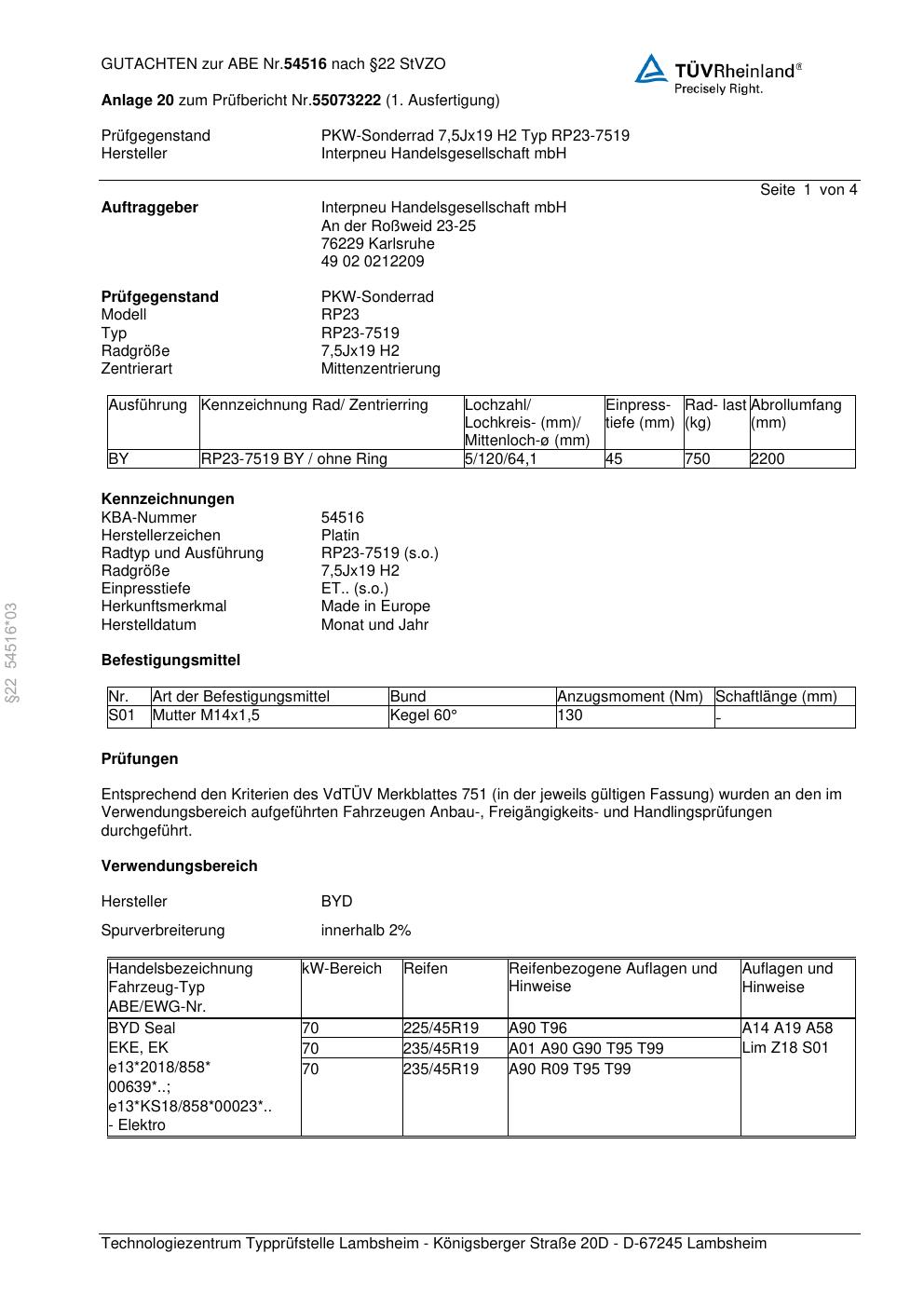 Dieses Gutachten (abe) bezieht sich auf die Alufelge Platin RP23-75 19 in der Ausführung 7.5Jx19 ET 0, Mittenloch 0 mm (KBA 54516). Im PDF findest du typischerweise zulässige Reifengrößen, Auflagen/Anbauhinweise und – je nach Dokument – Hinweise zur Eintragung.