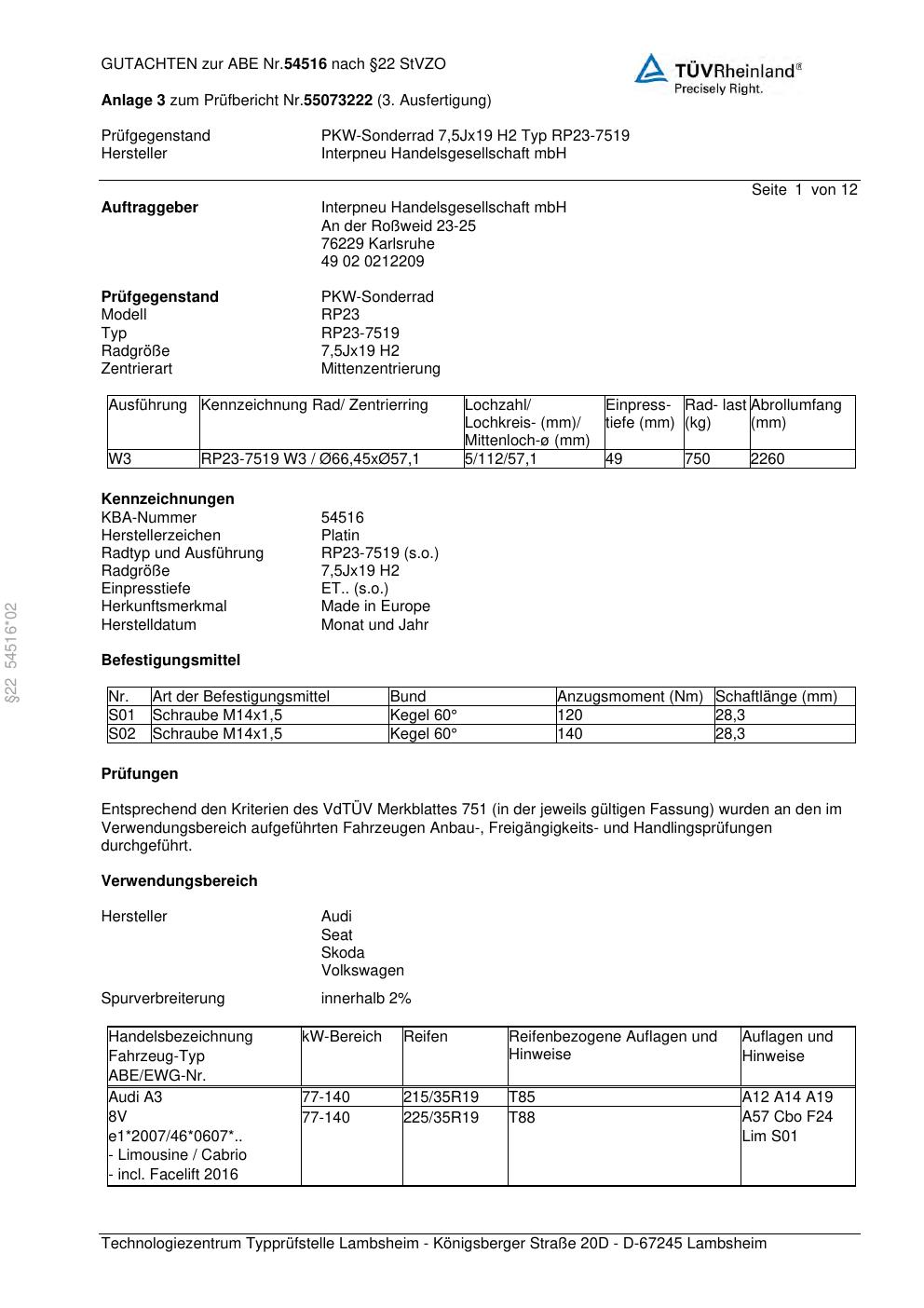 Dieses Gutachten (abe) bezieht sich auf die Alufelge Platin RP23-7519 in der Ausführung 7.5Jx19 ET 0, Mittenloch 0 mm (KBA 54516). Im PDF findest du typischerweise zulässige Reifengrößen, Auflagen/Anbauhinweise und – je nach Dokument – Hinweise zur Eintragung.