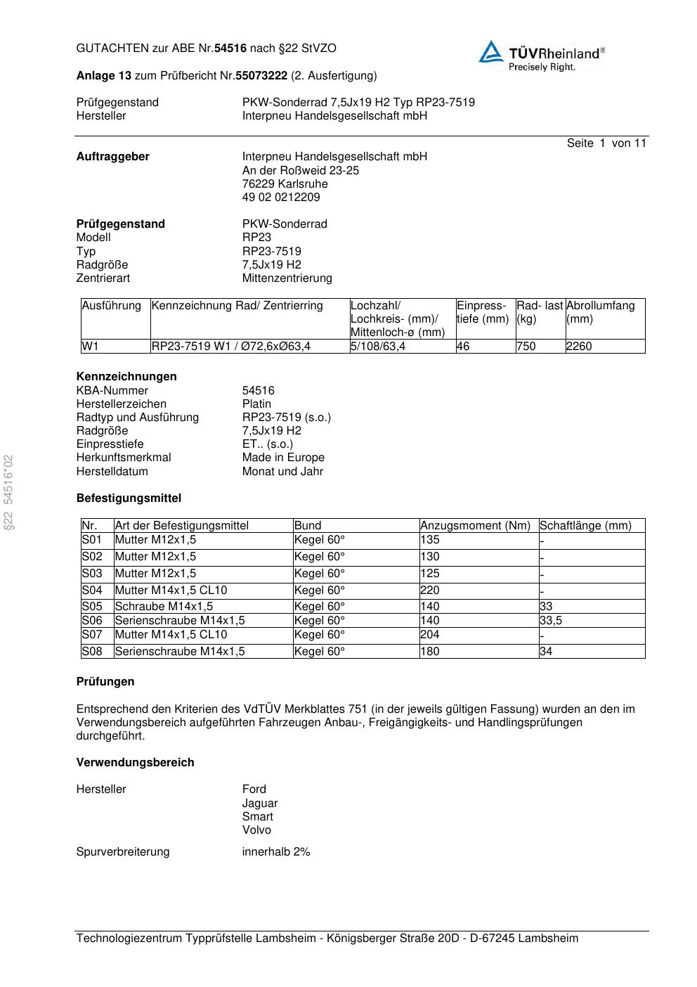 Dieses Gutachten (abe) bezieht sich auf die Alufelge Platin RP23-7519 in der Ausführung 7.5Jx19 ET 0, Mittenloch 0 mm (KBA 54516). Im PDF findest du typischerweise zulässige Reifengrößen, Auflagen/Anbauhinweise und – je nach Dokument – Hinweise zur Eintragung.