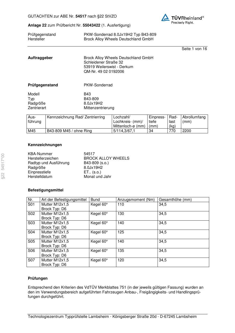 Dieses Gutachten (abe) bezieht sich auf die Alufelge Brock B43-809 in der Ausführung 8Jx19 ET 0, Mittenloch 0 mm (KBA 54517). Im PDF findest du typischerweise zulässige Reifengrößen, Auflagen/Anbauhinweise und – je nach Dokument – Hinweise zur Eintragung.