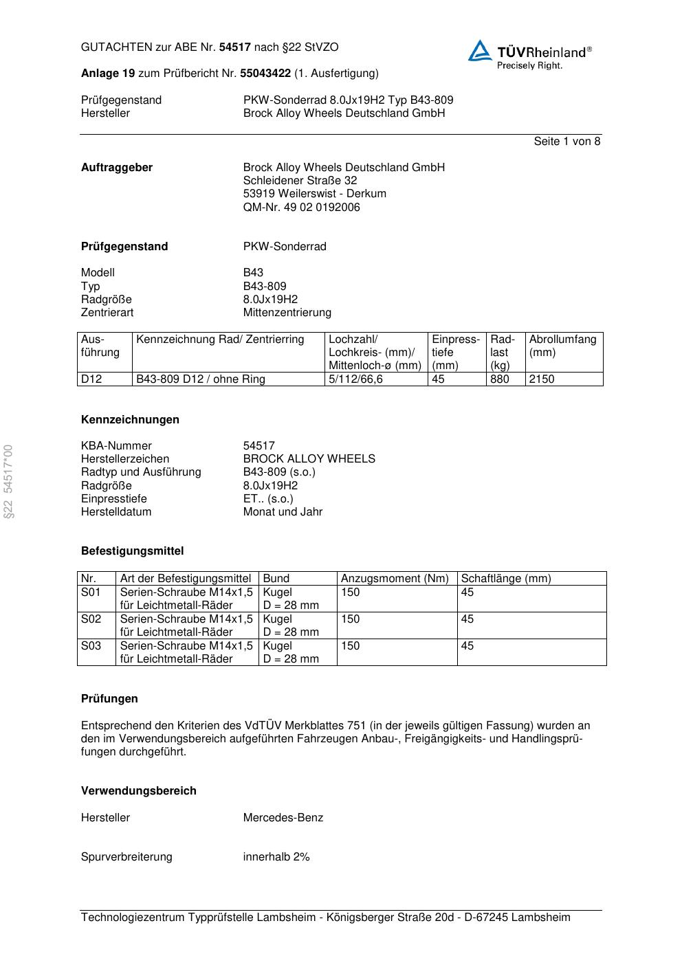 Dieses Gutachten (abe) bezieht sich auf die Alufelge Brock B43-809 in der Ausführung 8Jx19 ET 0, Mittenloch 0 mm (KBA 54517). Im PDF findest du typischerweise zulässige Reifengrößen, Auflagen/Anbauhinweise und – je nach Dokument – Hinweise zur Eintragung.