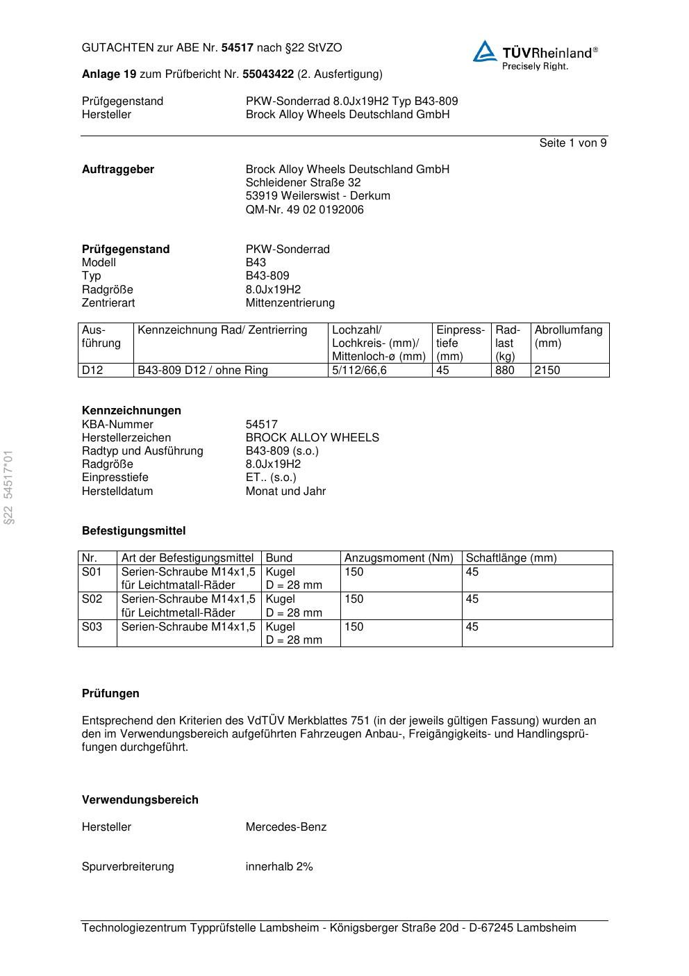 Dieses Gutachten (abe) bezieht sich auf die Alufelge Brock B43-809 in der Ausführung 8Jx19 ET 0, Mittenloch 0 mm (KBA 54517). Im PDF findest du typischerweise zulässige Reifengrößen, Auflagen/Anbauhinweise und – je nach Dokument – Hinweise zur Eintragung.