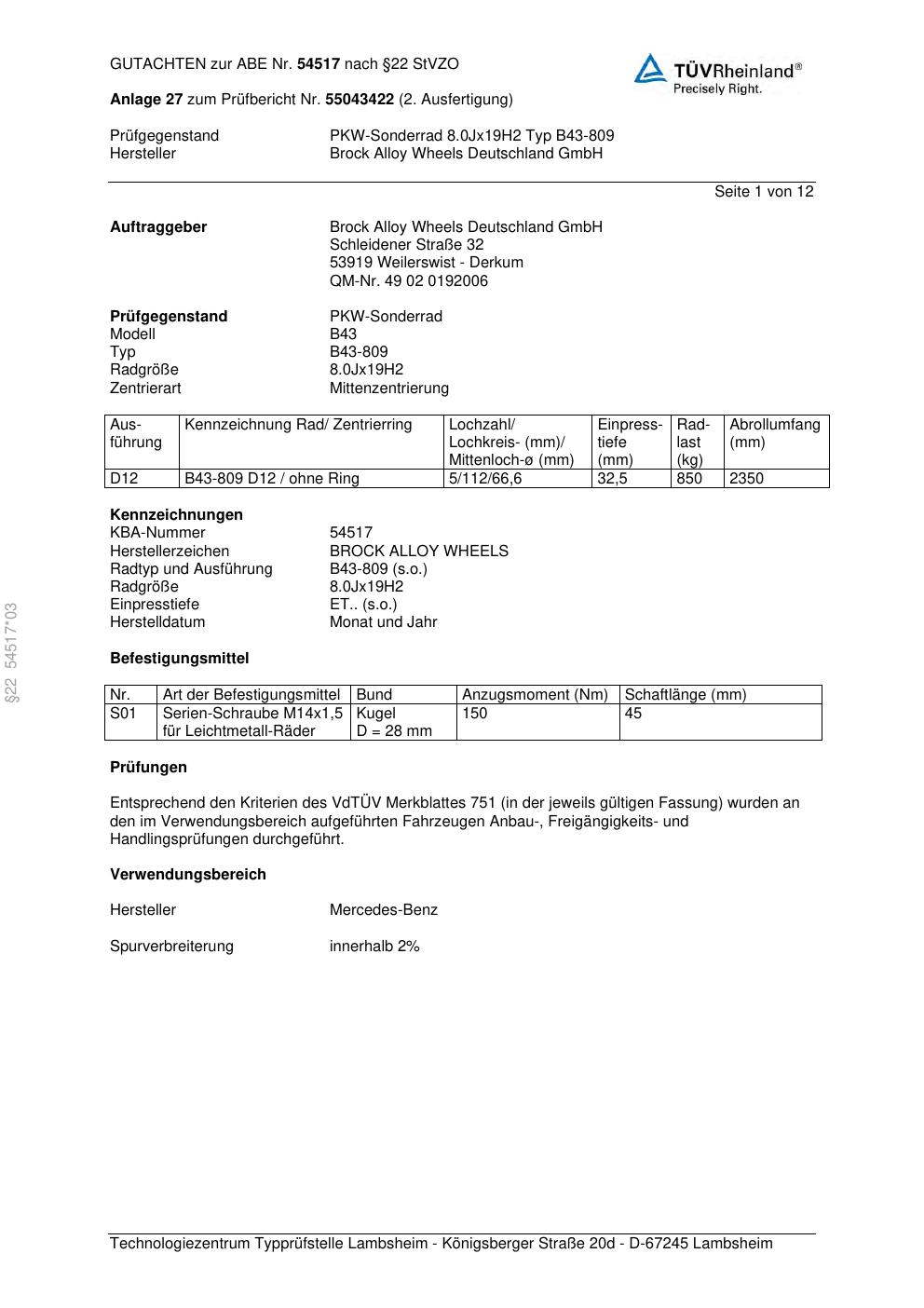 Dieses Gutachten (abe) bezieht sich auf die Alufelge Brock B43-809 in der Ausführung 8Jx19 ET 0, Mittenloch 0 mm (KBA 54517). Im PDF findest du typischerweise zulässige Reifengrößen, Auflagen/Anbauhinweise und – je nach Dokument – Hinweise zur Eintragung.
