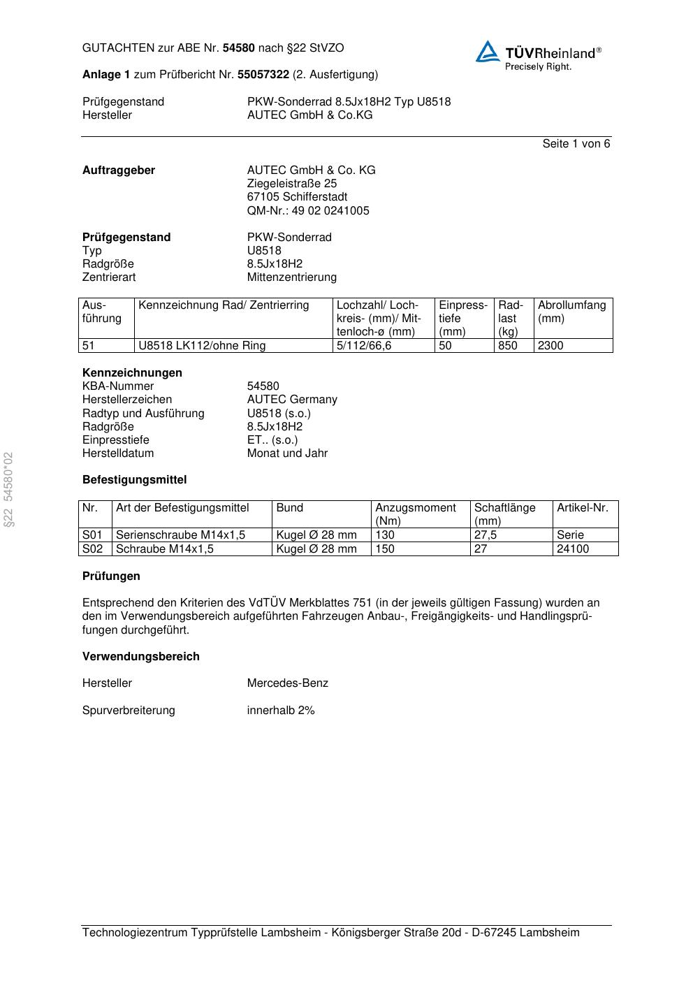 Dieses Gutachten (abe) bezieht sich auf die Alufelge Autec U8518 in der Ausführung 8.5Jx18 ET 0, Mittenloch 0 mm (KBA 54580). Im PDF findest du typischerweise zulässige Reifengrößen, Auflagen/Anbauhinweise und – je nach Dokument – Hinweise zur Eintragung.