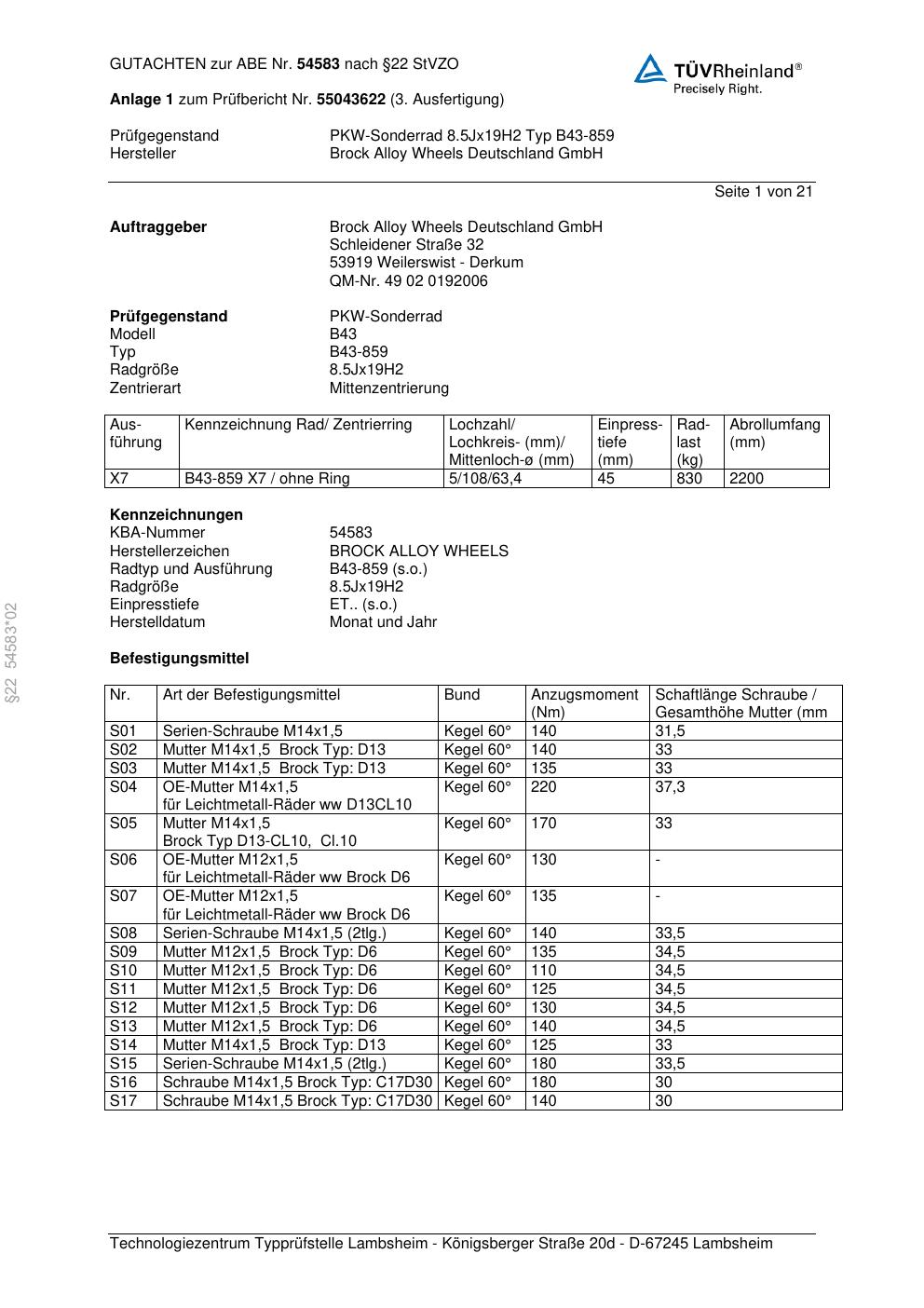 Dieses Gutachten (abe) bezieht sich auf die Alufelge Brock B43-859 in der Ausführung 8.5Jx19 ET 0, Mittenloch 0 mm (KBA 54583). Im PDF findest du typischerweise zulässige Reifengrößen, Auflagen/Anbauhinweise und – je nach Dokument – Hinweise zur Eintragung.