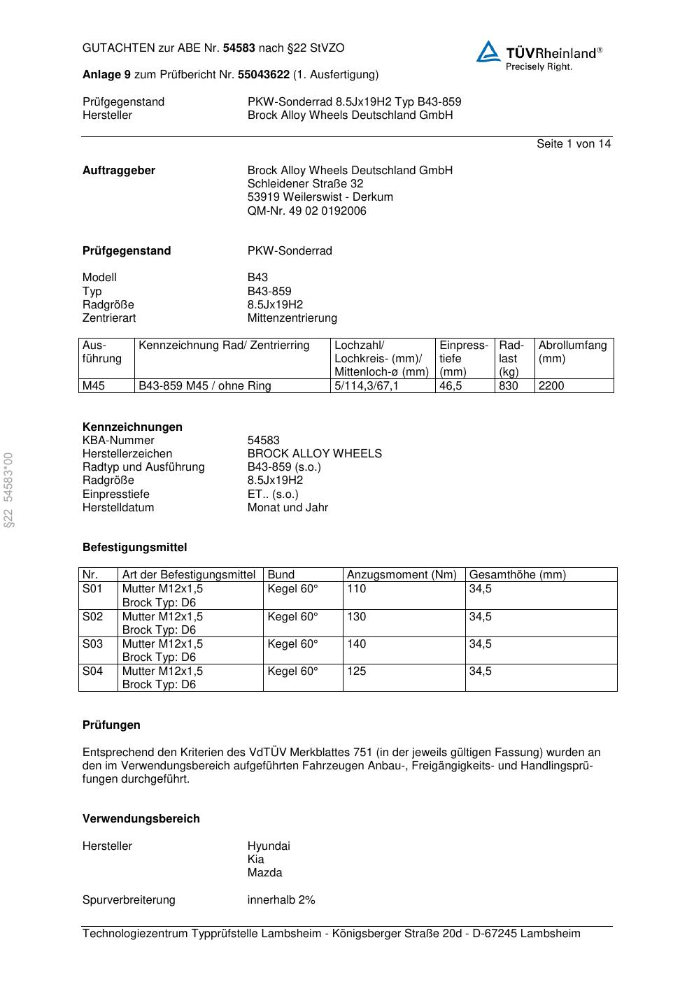 Dieses Gutachten (abe) bezieht sich auf die Alufelge Brock B43-859 in der Ausführung 8.5Jx19 ET 0, Mittenloch 0 mm (KBA 54583). Im PDF findest du typischerweise zulässige Reifengrößen, Auflagen/Anbauhinweise und – je nach Dokument – Hinweise zur Eintragung.