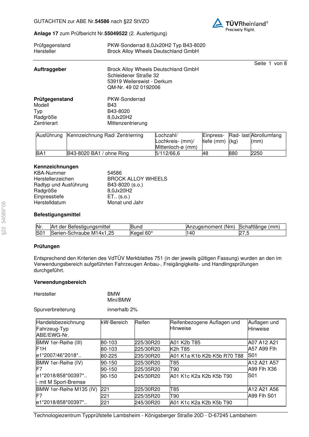 Dieses Gutachten (abe) bezieht sich auf die Alufelge Brock B43-8020 in der Ausführung 8Jx2 ET 0, Mittenloch 0 mm (KBA 54586). Im PDF findest du typischerweise zulässige Reifengrößen, Auflagen/Anbauhinweise und – je nach Dokument – Hinweise zur Eintragung.