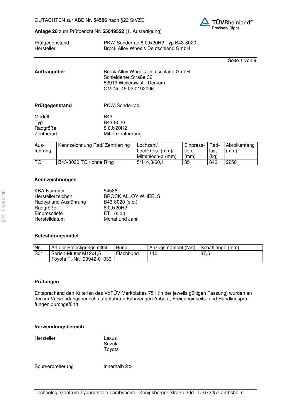 Dieses Gutachten (abe) bezieht sich auf die Alufelge Brock B43-8020 in der Ausführung 8Jx2 ET 0, Mittenloch 0 mm (KBA 54586). Im PDF findest du typischerweise zulässige Reifengrößen, Auflagen/Anbauhinweise und – je nach Dokument – Hinweise zur Eintragung.