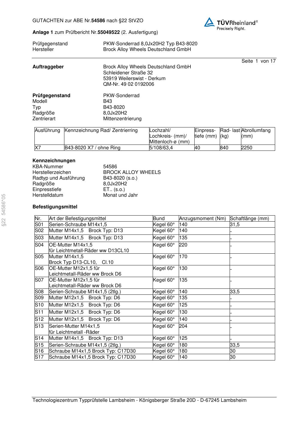 Dieses Gutachten (abe) bezieht sich auf die Alufelge Brock B43-8020 in der Ausführung 8Jx2 ET 0, Mittenloch 0 mm (KBA 54586). Im PDF findest du typischerweise zulässige Reifengrößen, Auflagen/Anbauhinweise und – je nach Dokument – Hinweise zur Eintragung.