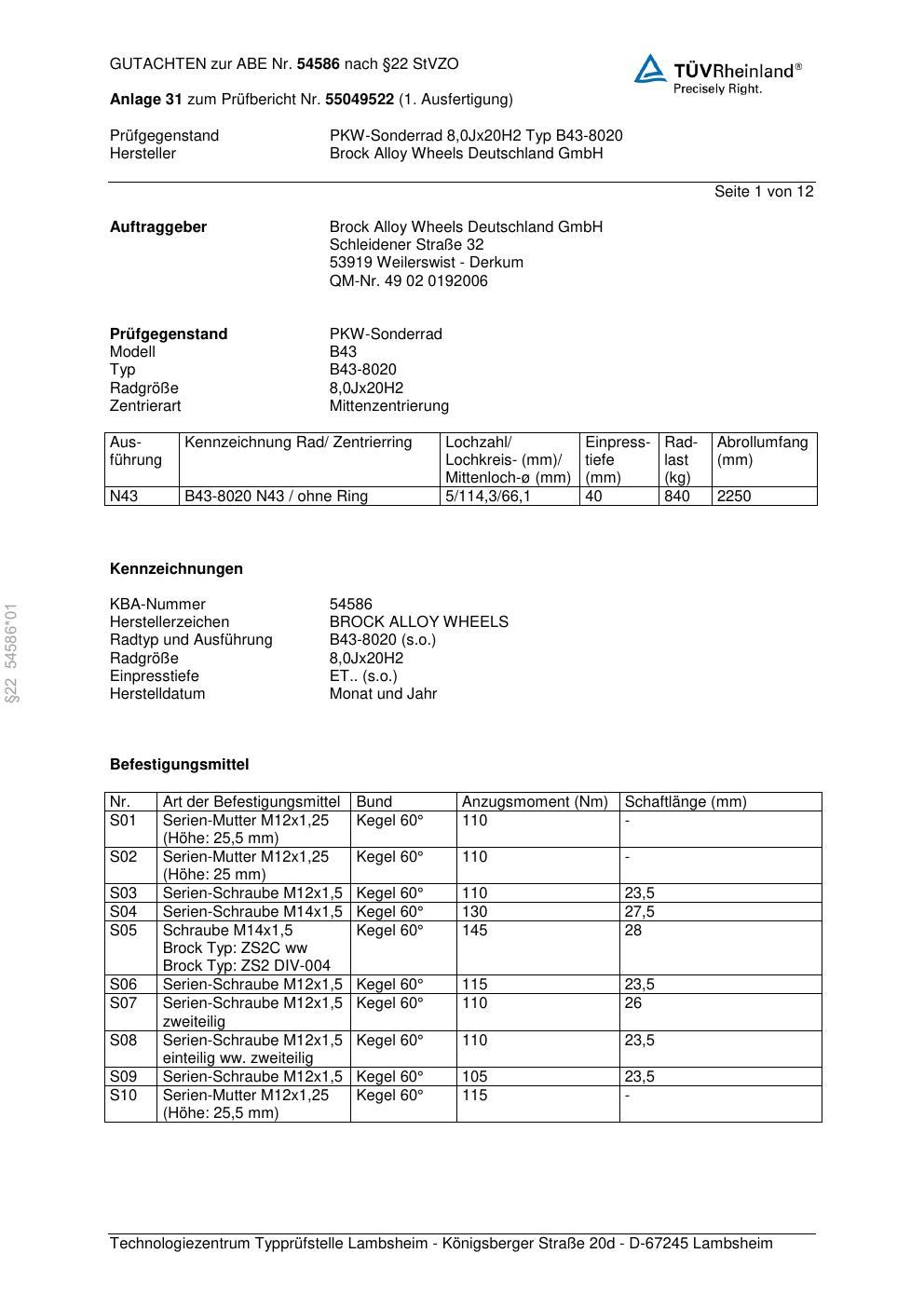Dieses Gutachten (abe) bezieht sich auf die Alufelge Brock B43-8020 in der Ausführung 8Jx2 ET 0, Mittenloch 0 mm (KBA 54586). Im PDF findest du typischerweise zulässige Reifengrößen, Auflagen/Anbauhinweise und – je nach Dokument – Hinweise zur Eintragung.