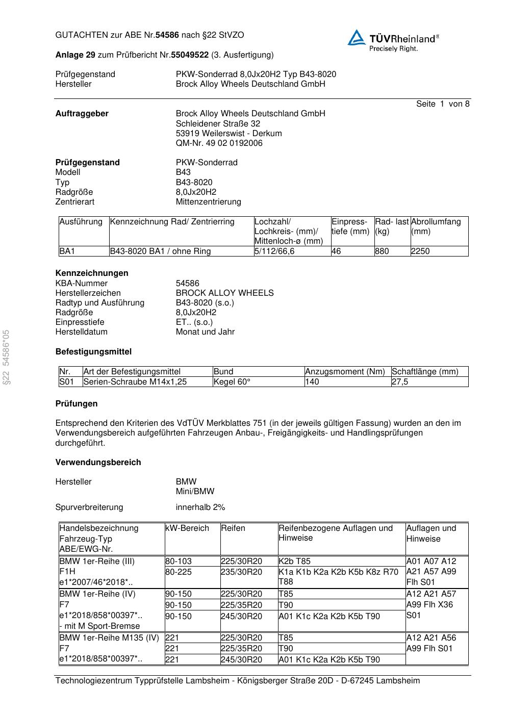 Dieses Gutachten (abe) bezieht sich auf die Alufelge Brock B43-8020 in der Ausführung 8Jx2 ET 0, Mittenloch 0 mm (KBA 54586). Im PDF findest du typischerweise zulässige Reifengrößen, Auflagen/Anbauhinweise und – je nach Dokument – Hinweise zur Eintragung.