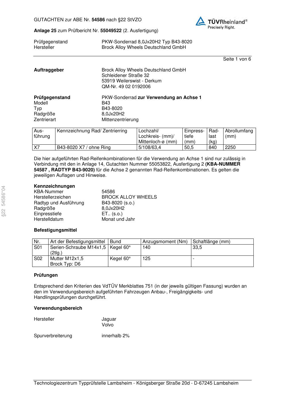 Dieses Gutachten (abe) bezieht sich auf die Alufelge Brock B43-8020 in der Ausführung 8Jx2 ET 0, Mittenloch 0 mm (KBA 54586). Im PDF findest du typischerweise zulässige Reifengrößen, Auflagen/Anbauhinweise und – je nach Dokument – Hinweise zur Eintragung.
